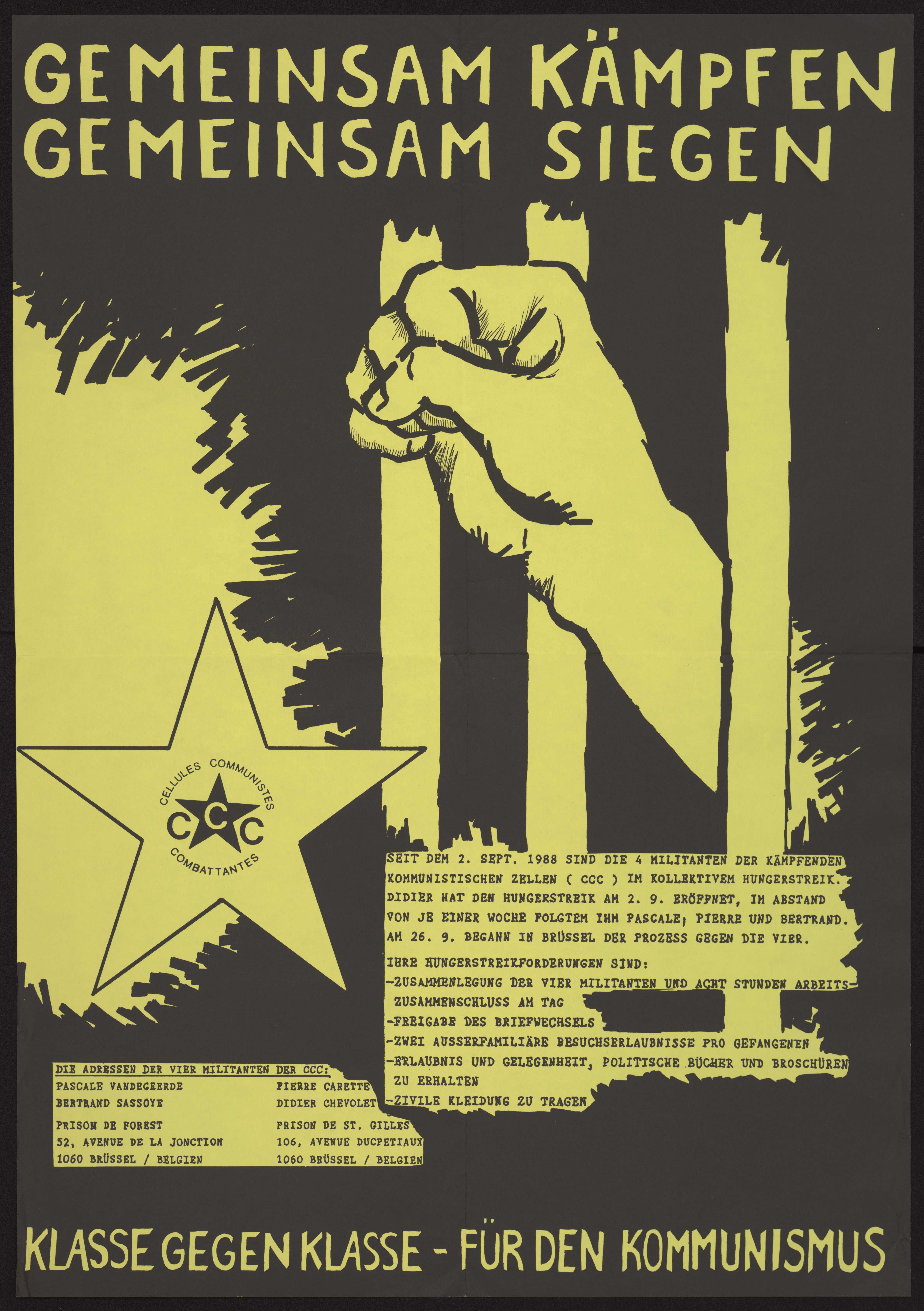 Poster shows a clenched fist held up between two cell bars. To the left of that image is a star. In the center of the star is a smaller black star with CCC across it and "Cellules Communistes Combattantes" encircling it. Text on the lower half of the poster gives the approximate dates the prisoners began their hunger strikes. Strike demands are also listed: housing all four in the same prison, an 8 hour work day, access to correspondence, allowance of two unrelated visitors per prisoner, permission to read and possess political materials, and permission to wear civilian clothing. Includes the prisoners' addresses (in two separate prisons) in Brussels, Belgium and the prisoners' names: Pascale Vandegeerde, Bertrand Sassoye, Pierre Carette, and Didier Chevolet. The poster shows solidarity for imprisoned communist comrades. Poster printed in black and yellow ink.