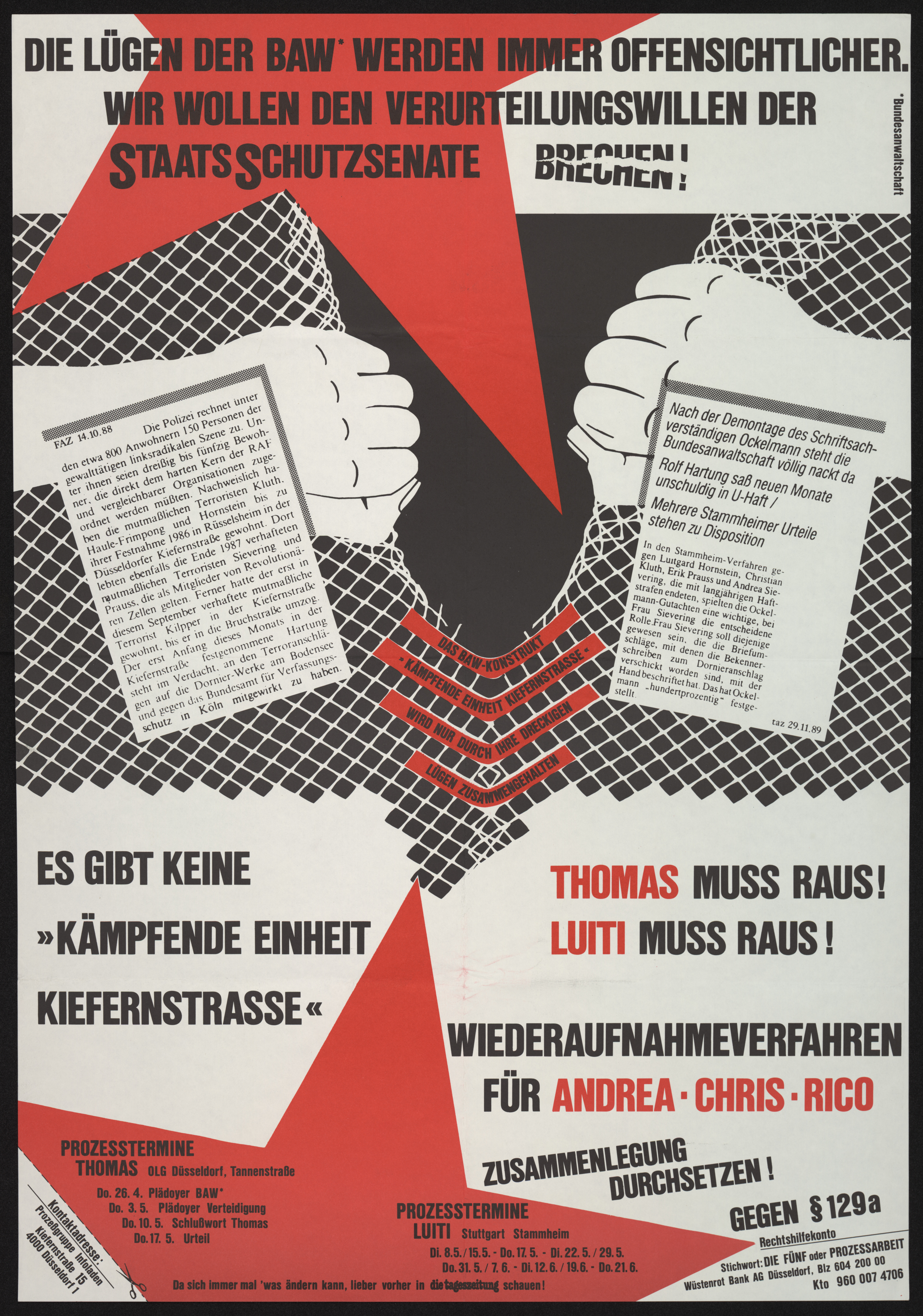 Poster shows a fence with two hands prying it apart. On either side are two newspaper articles. Title is above image with remaining text below. A partial red star is at the top of the image and another partial red star is at the bottom. Ink is black and red.
