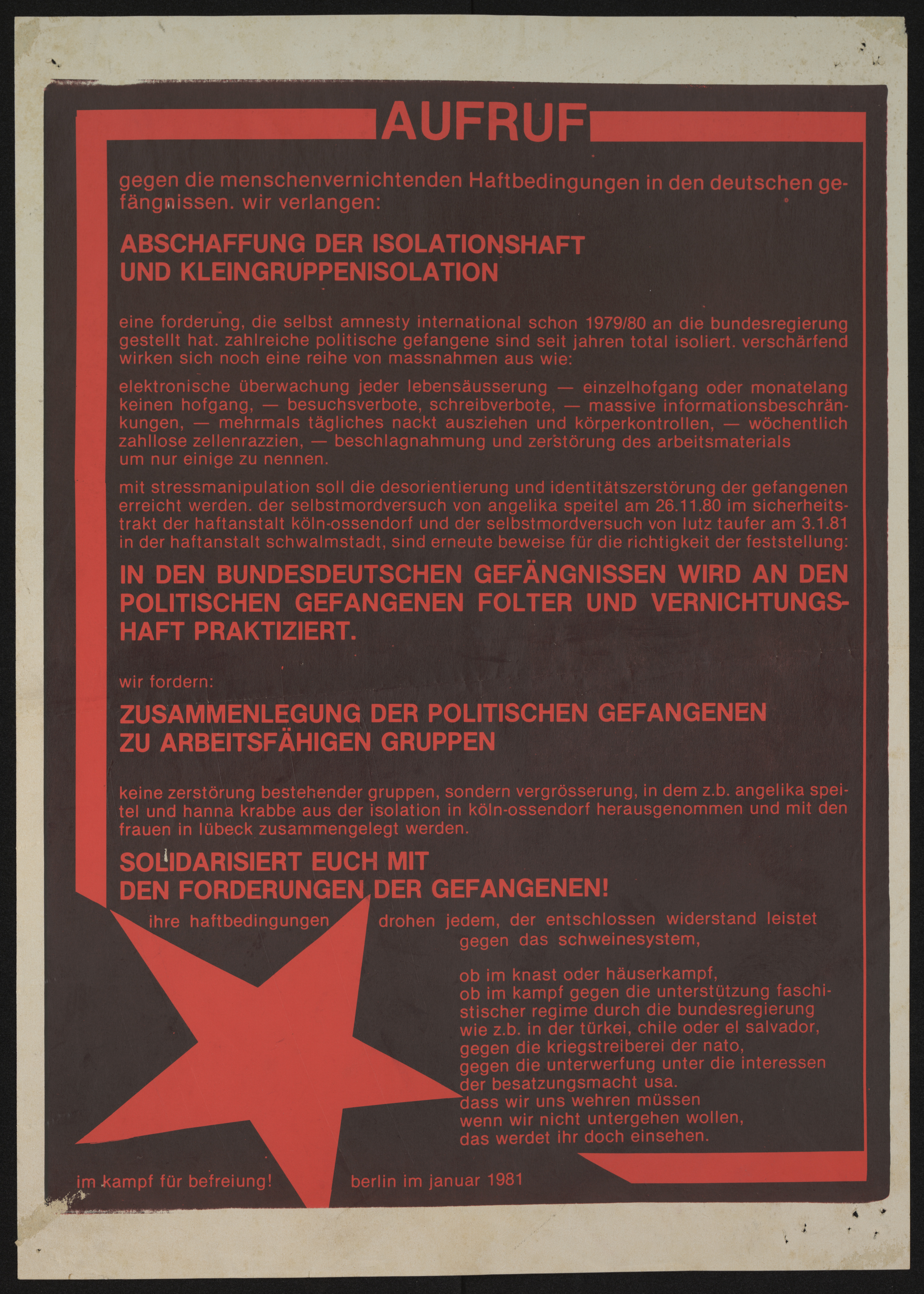 Poster shows text in red ink describing prison conditions in West Germany for political prisoners and demanding reform. A red star is in the lower right corner. Border and text are red on a brown background.