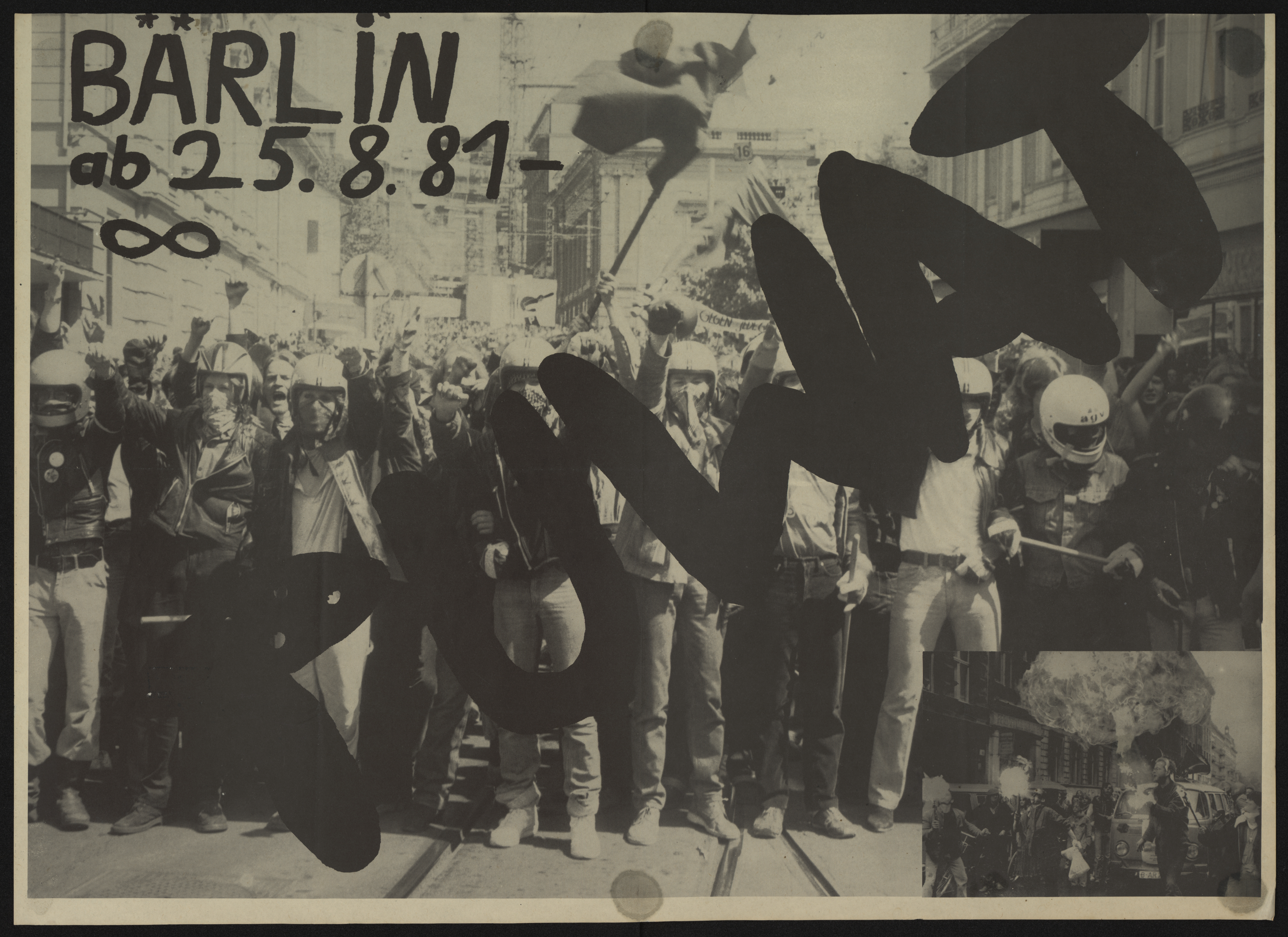 Poster shows street protesters with raised fists, faces covered with scarves, and many wearing helmets. The social unrest was due to urban renewal related evictions from residential buildings in Berlin, Germany. Inset at bottom right shows people below a fireball set off beside a Volkswagen van while two men with lighted torches stand nearby. TUWAT exhorts people to do something.