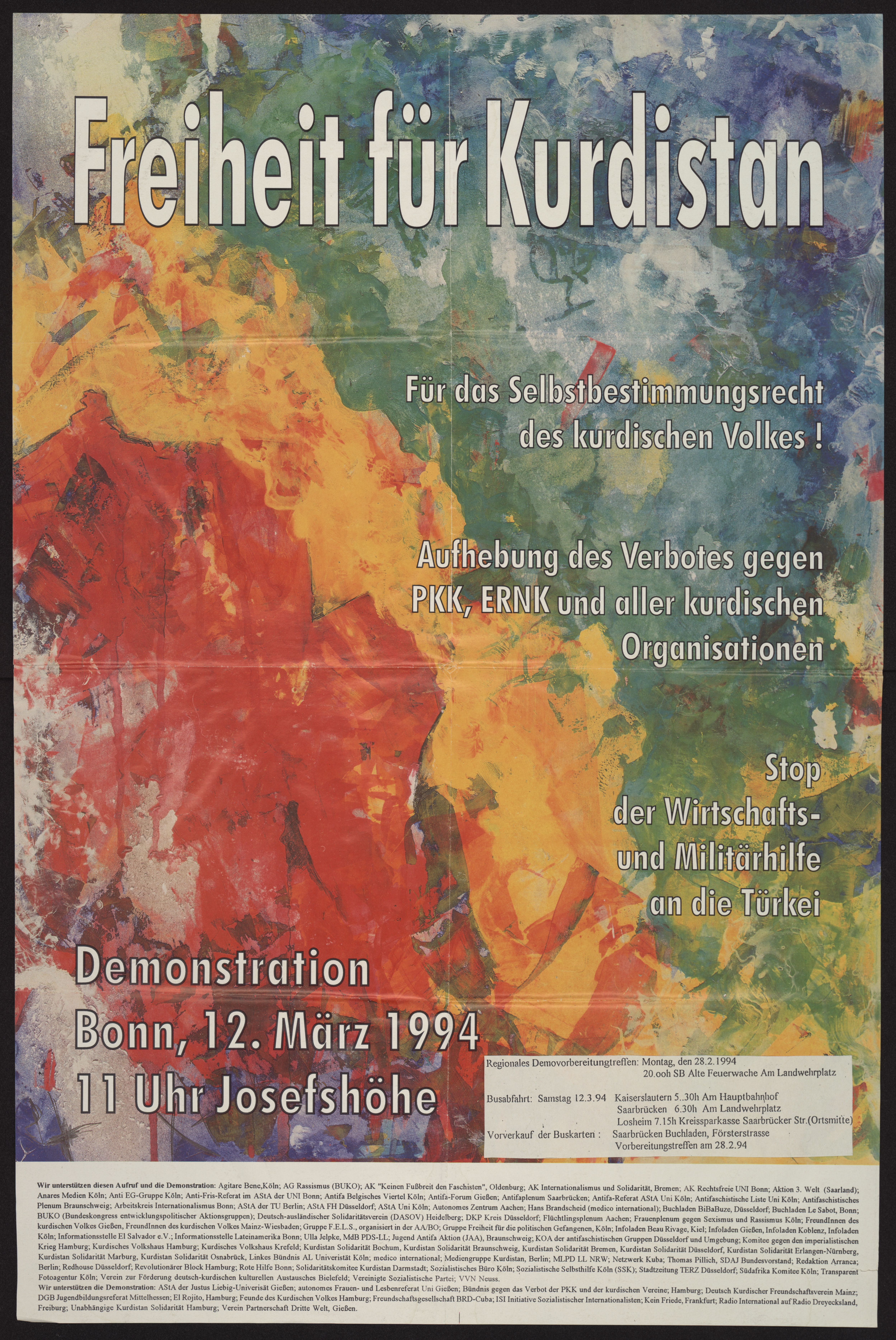Freiheit für Kurdistan : für das Selbstbestimmungsrecht des kurdischen Volkes!, Aufhebung des Verbotes gegen PKK, ERNK und aller kurdischen Organisationen, Stop der Wirtschafts- und Militärhilfe an der Türkei : Demonstration, Bonn, 12. März 1994, ...