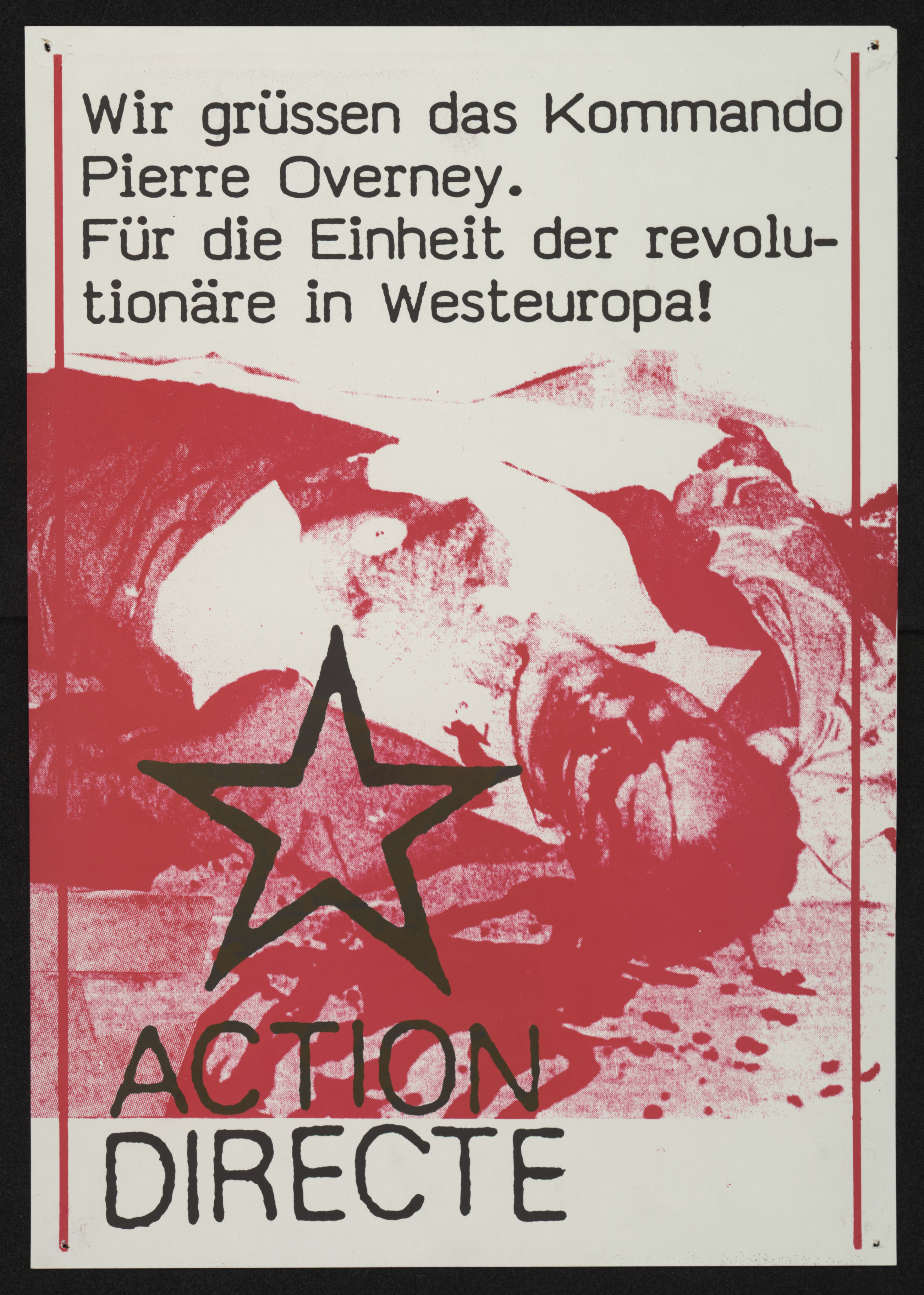 Poster shows a brown and white image of the November 1986 assassination of George Besse, president of Renault. French terrorist organization Action directe claimed responsibility for the killing. Pierre Overney, named in title, was a French worker (fired from Renault) and maoist political activist who was fatally shot to death by a security guard in 1972 as he distributed pamphlets outside Renault. Shows solidarity with Western European revolutionaries.
