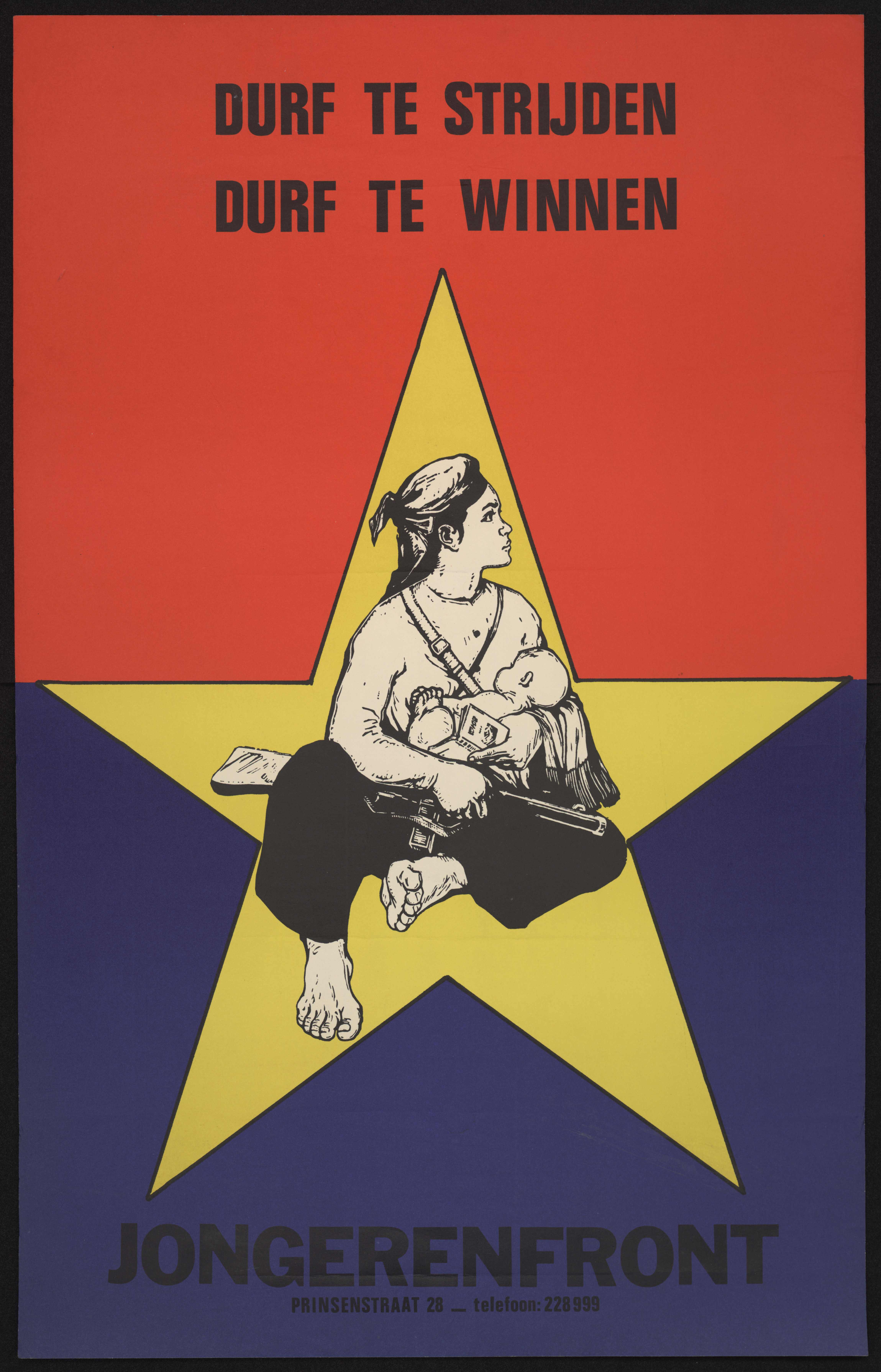 Poster bissected by large yellow star. Top half is red, bottom half is blue. Superimposed on the star is a seated young woman holding an infant, a sub-machine gun, and a small book. She is barefoot, wearing long loose-fitting black pants and a simple white top with long sleeves. A scarf is tied around her forehead and a cloth of some sort is draped over her left arm. Ink is red, yellow, blue, and black.