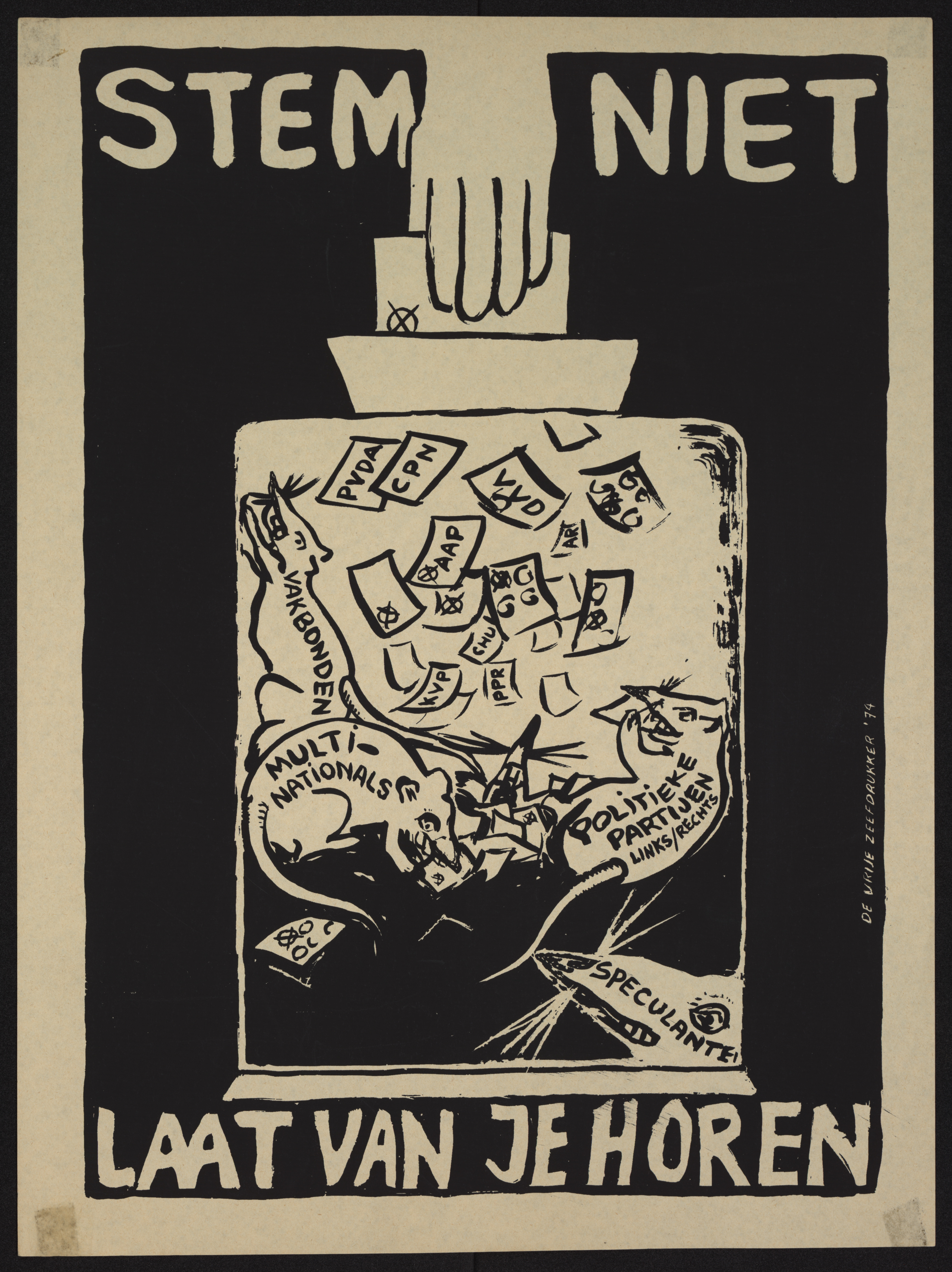 Poster shows a black and white drawing of a large, transparent jar full of rats and election ballots. There is a hand dropping a ballot into the jar. The rats are labeled for different groups: labor unions, speculators, and political parties (both left and right). They are chewing up ballots marked with the acronyms of various political parties in the Netherlands: PVDA, CPN, AAP, ARP, PPR, KVP, and CHU.