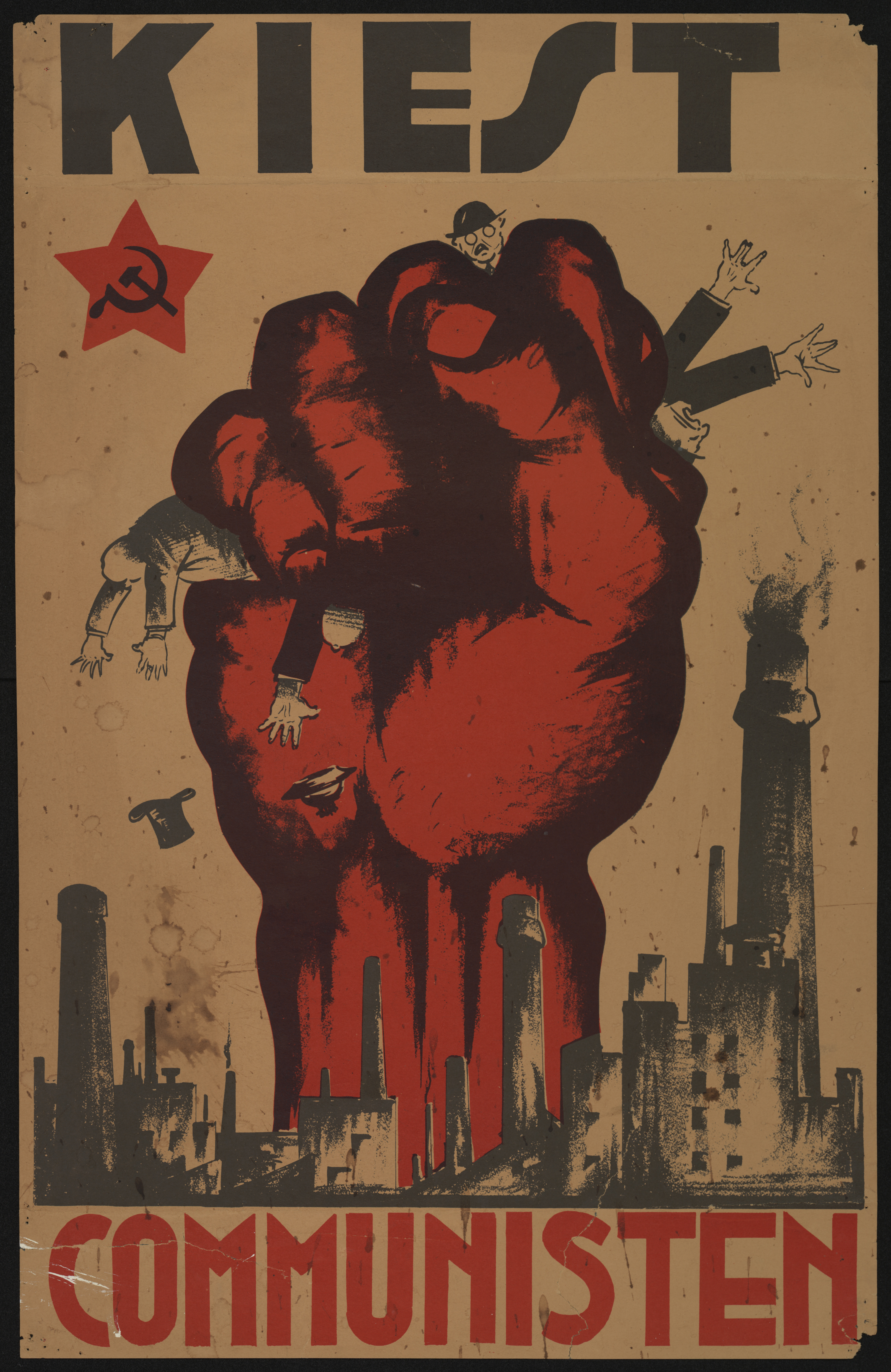 Poster shows a drawing of a huge red fist thrust into the sky above a sooty cityscape of industrial buildings and smoke stacks. Within its grasp are four helpless cartoon figures of men. In the upper left of the poster is a red star with a black hammer and sickel crossed in the middle. Ink is red and black.