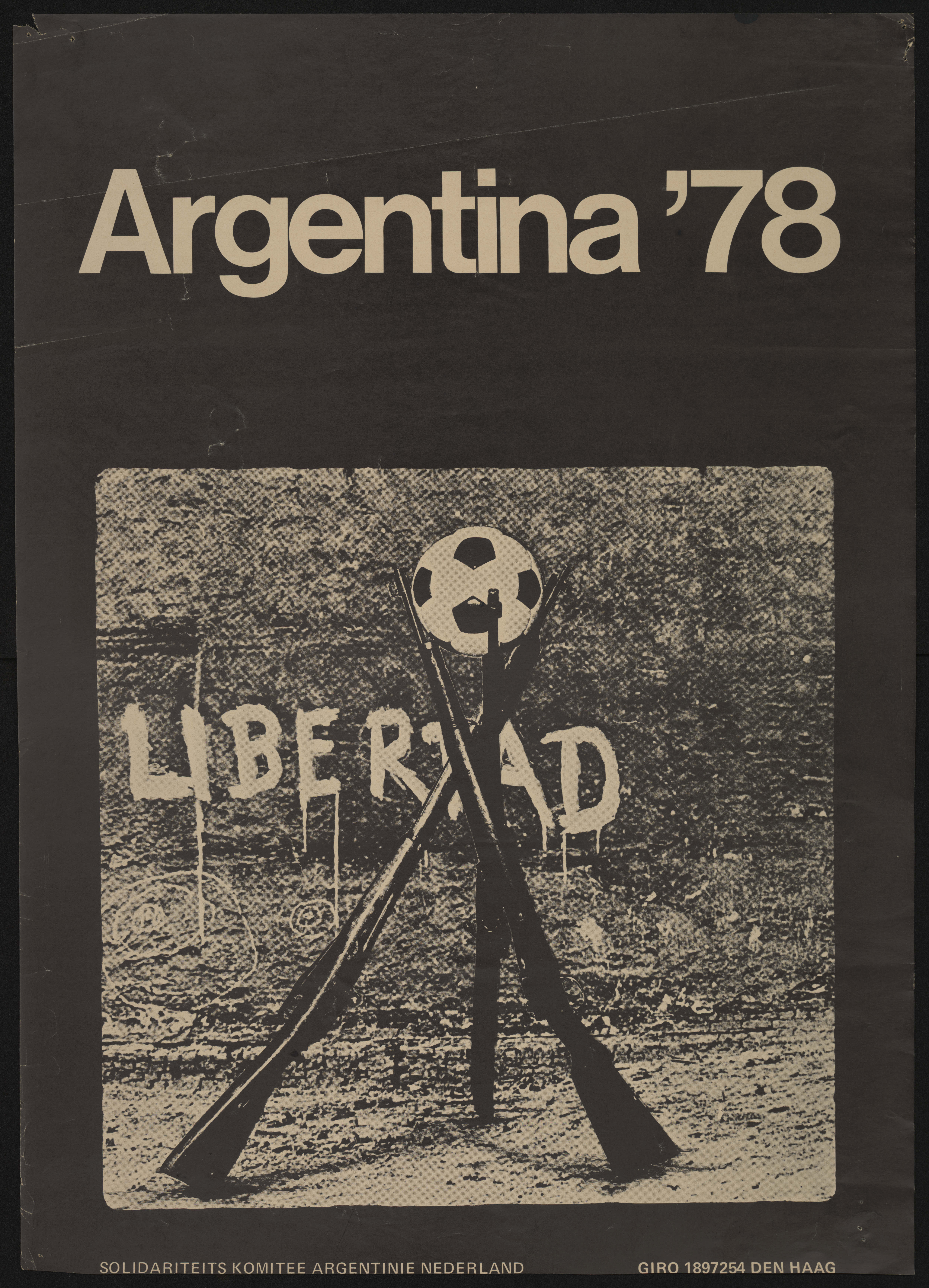 Poster shows black and white image of three rifles standing in a tripod with a soccer ball resting in the area just above where the barrels cross. That is a reference to the suspected involvement of Argentina's military junta in World Cup victory of the Argentine team in a year when that country hosted the games. Ink is black.