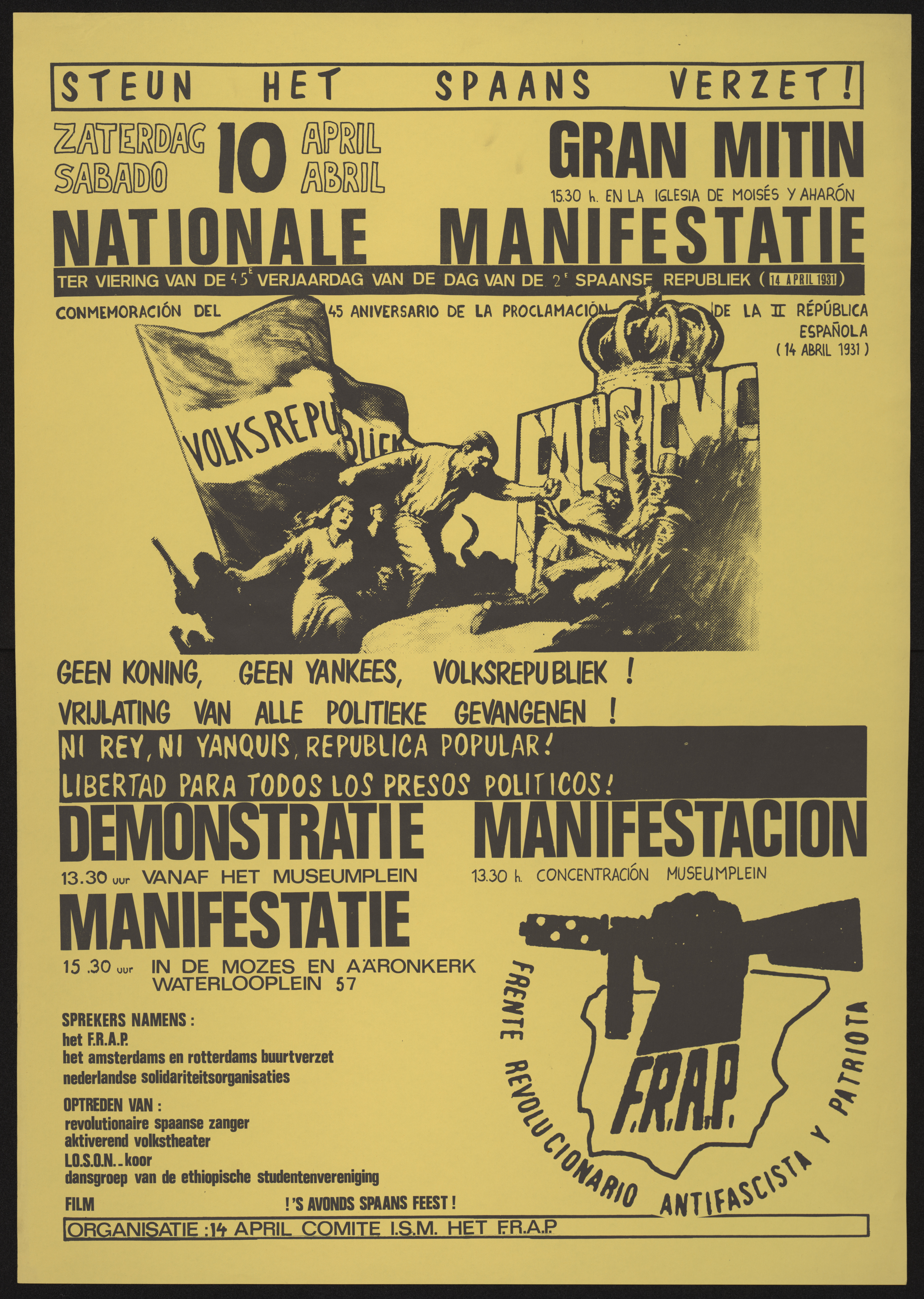 Poster shows a center illustration of two opposing groups. The group to the left is advancing with clenched fists and weapons (a gun and a sickle). They march below a large flagged marked "Volksrepubliek." The group to the right shows two fearful men in suits and hats with their hands in the air as they stare at the advancing group. Beside them is a wide-eyed soldier with his back turned away from the advancing crowd. The second group is in front of large, uppercase letters spelling "FASCISME" upon which sits a crown with a cross on top of it. Poster gives details about a rally and demonstrations to commemorate the 45th anniversary of the second Spanish Republic (founded April 14, 1931). Slated speakers were from the Frente Revolucionario Antifascista y Patriota and some Dutch resistance and solidarity organizations. A choir and an Ethiopian student dance group are listed performers. A film was also listed on the poster: !S' avonds spaans feest! Ink is black on pale yellow paper.