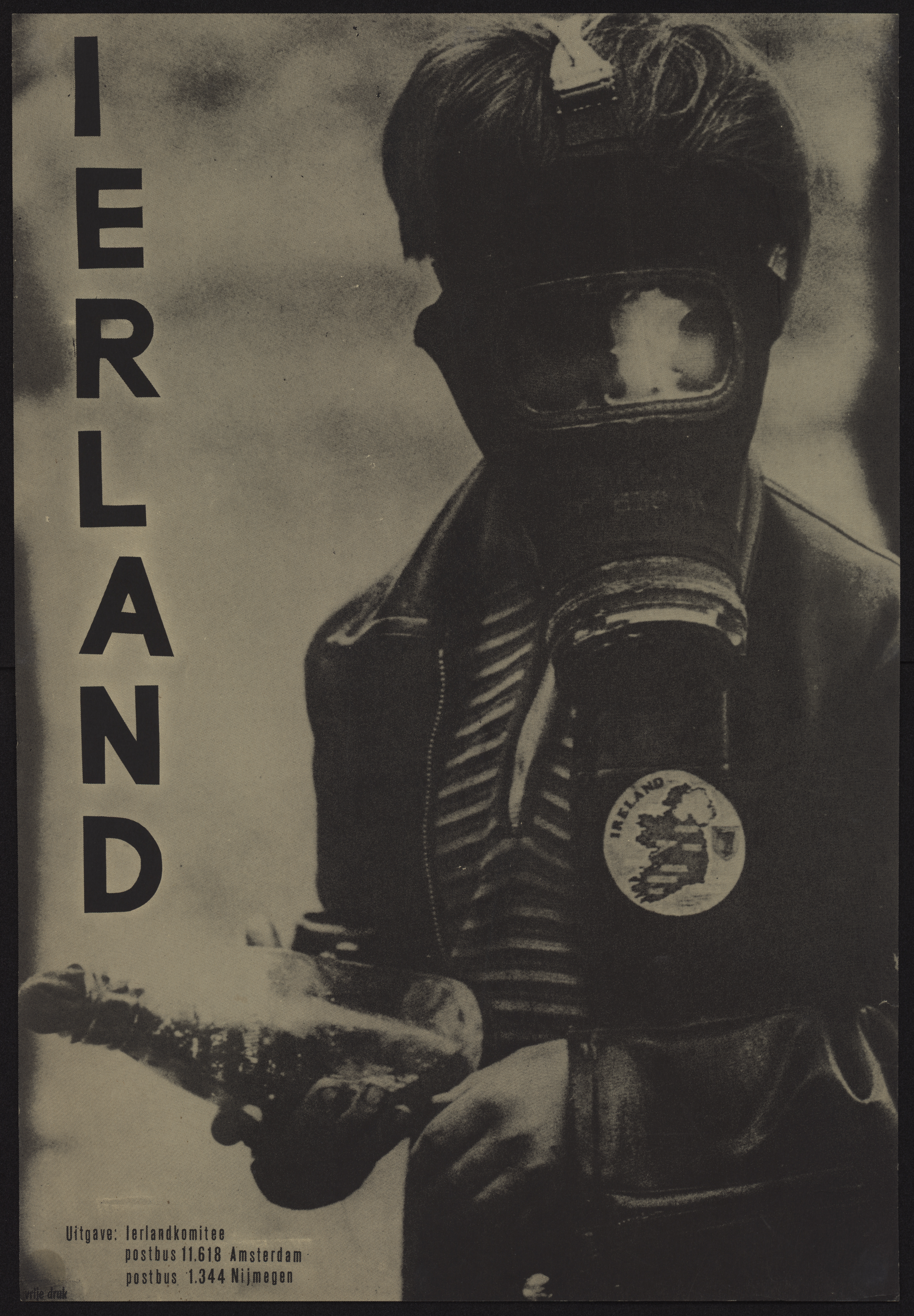 Poster shows black and white image of a person wearing a gas mask, holding a Molotov cocktail, and with a badge on their jacket printed with "Ierland" on the outer edge and a map of Ireland in the center. IERLAND is printed in black down the left side of the poster.