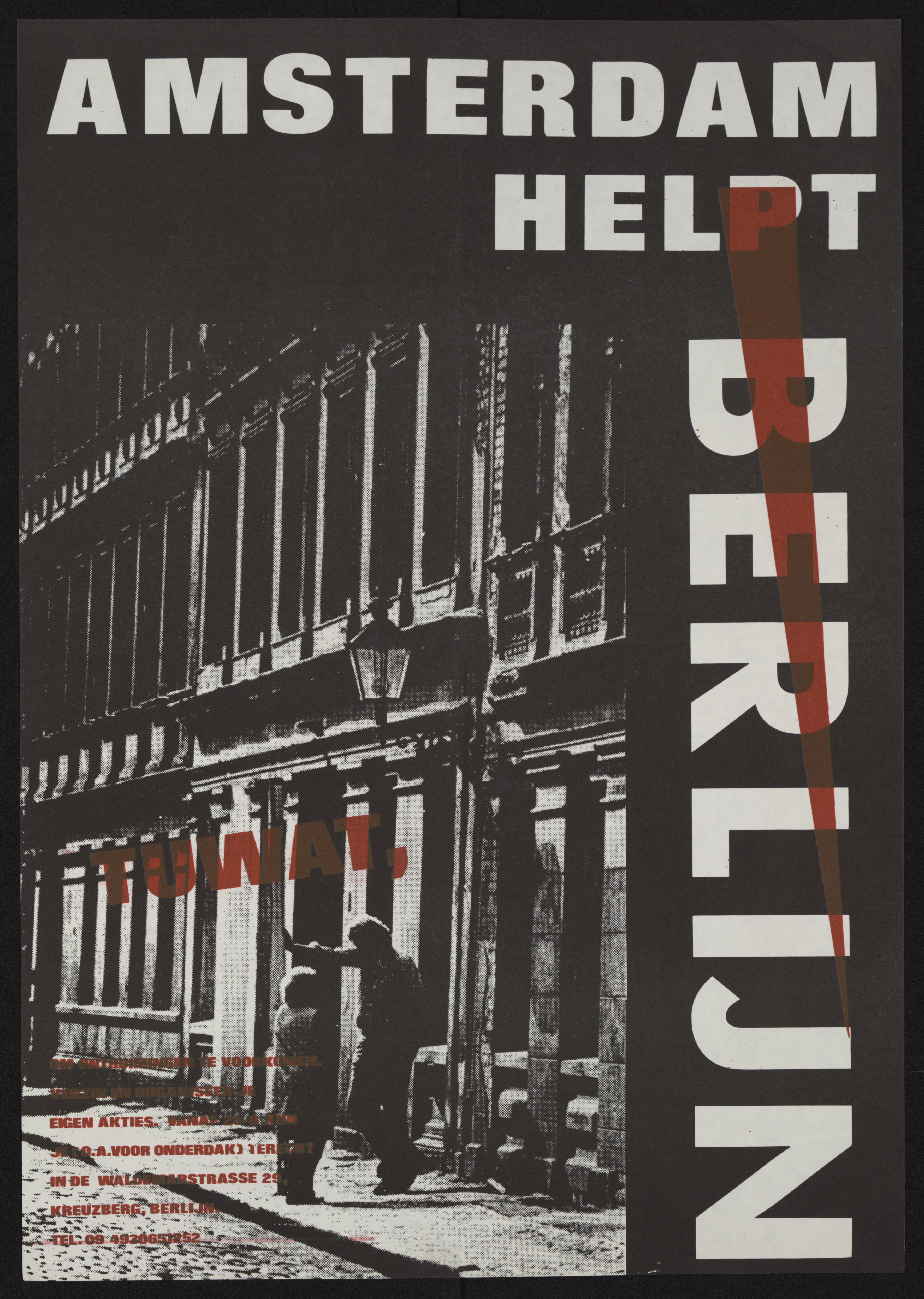 Poster shows a black and white nighttime image of a man and a woman in conversation on the sidewalk flanking a cobblestone street. They stand before a row of multi-storied stone buildings. This poster advertises a meeting of TUWAT ("do something") in support of the sqatters movement in Berlin, Germany. TUWAT hopes to prevent the demolition of older, occupied residential buildings. The poster appeals to Dutch sympathizers to rally in support of the Berlin protesters. Ink is black and red. Text is in red.