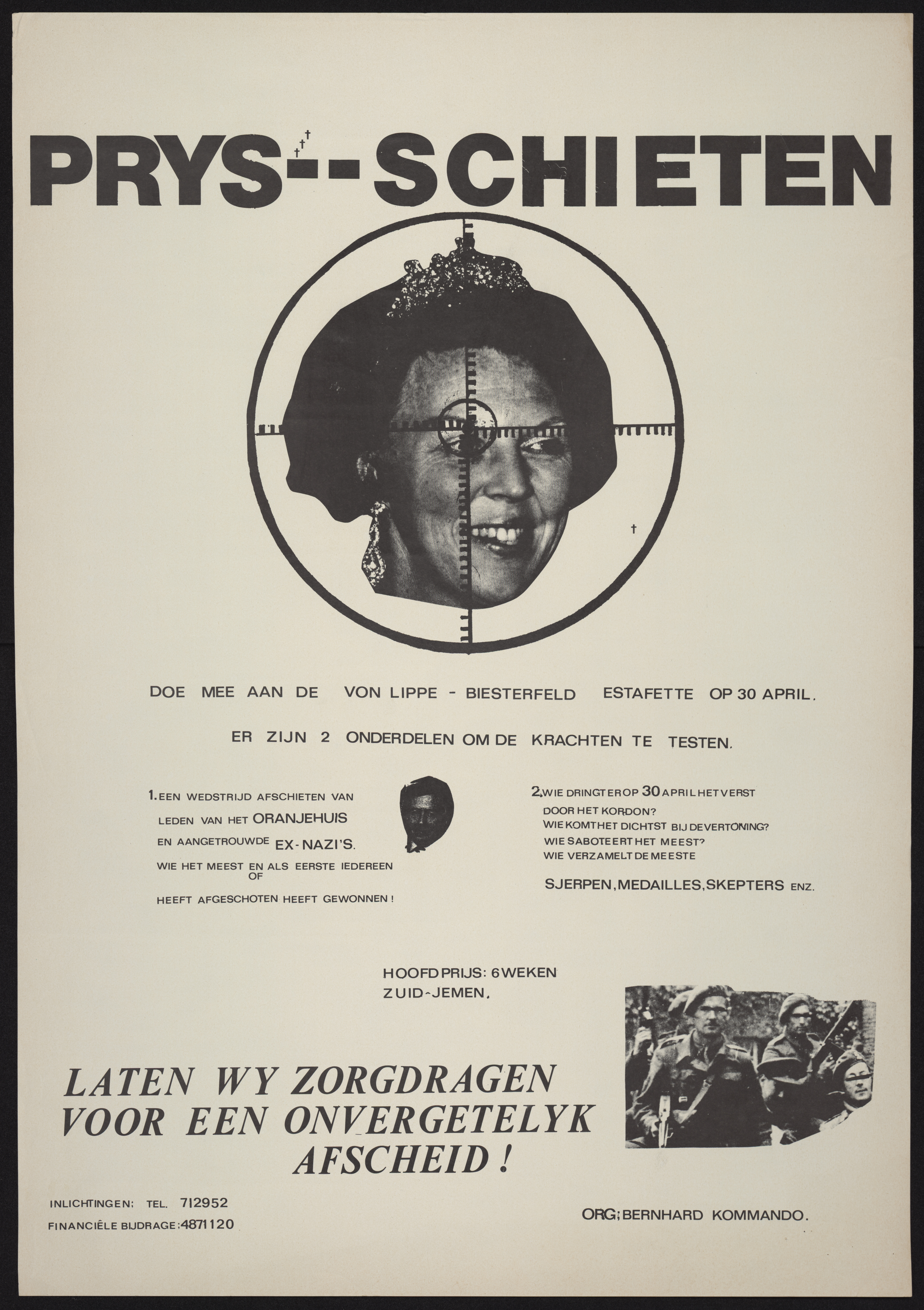 At top center, poster shows the head of Princess Beatrix of the Netherlands wearing a tiara and drop-earrings. Her smiling face is centered in the crosshairs of a weapon's scope. In the center is a small image of the face of an unidentified man. Bottom right shows five uniformed men, three armed with rifles. That image is captioned: "Org: Bernhard Kommando." The date of the alleged competition is the same date that Princess Beatrix, who had married a German, would be crowned Queen after the abdication of her mother, Queen Juliana. The announcement of a fake shooting competition appears to be black humor aimed at the Dutch monarchy and Beatrix in particular.