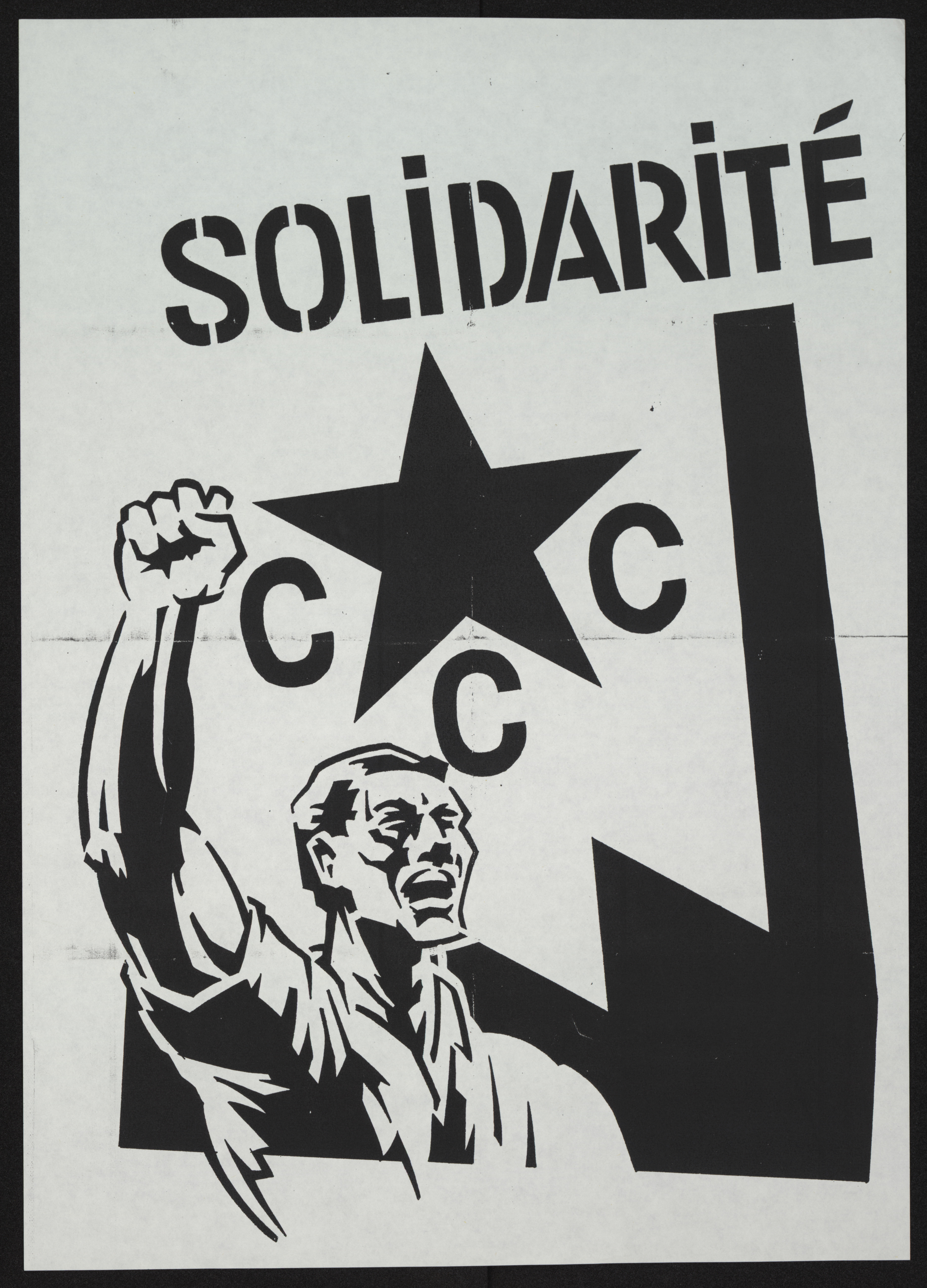 Poster shows a brawny man shouting with his right arm raised above his head, fist clenched. Above him is a large black star with the letters CCC below it denoting Communist Combatant Cells, a Belgian terrorist organization active in the mid-1980s and linked to several bombings. Ink is black.