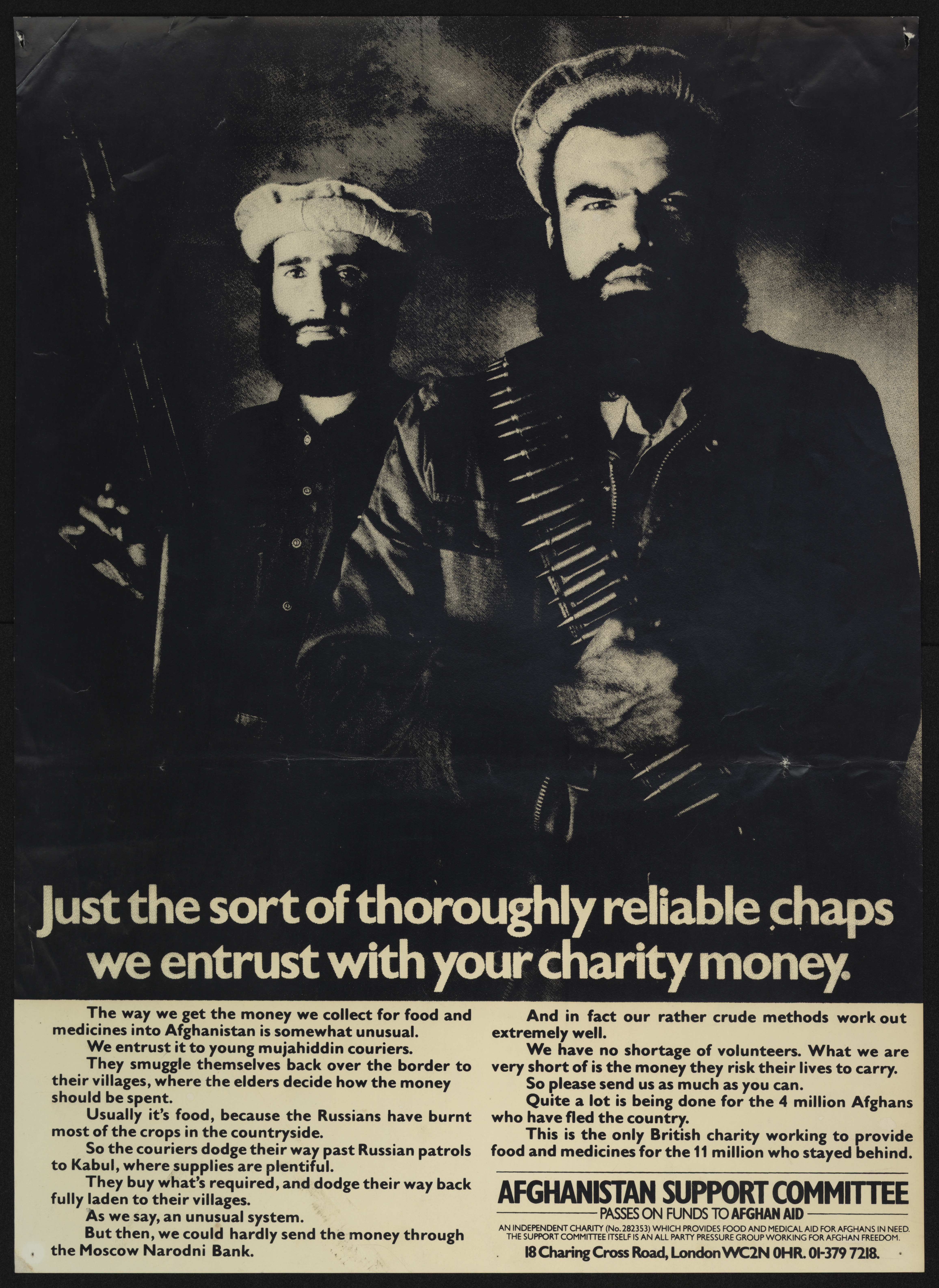 Poster shows black and white image of two armed Afghan mujahiddin couriers, each wearing a pakol, and staring straight into the camera. The man in front has a bandolier slung over his right shoulder. His right fist is clenched. The man in the rear holds up an unidentified long-gun. Except for their traditional caps, both men appear to be in western style clothing. Both have full beards. This poster is a plea for donations to help the civilian population trapped in war-torn Afghanistan.