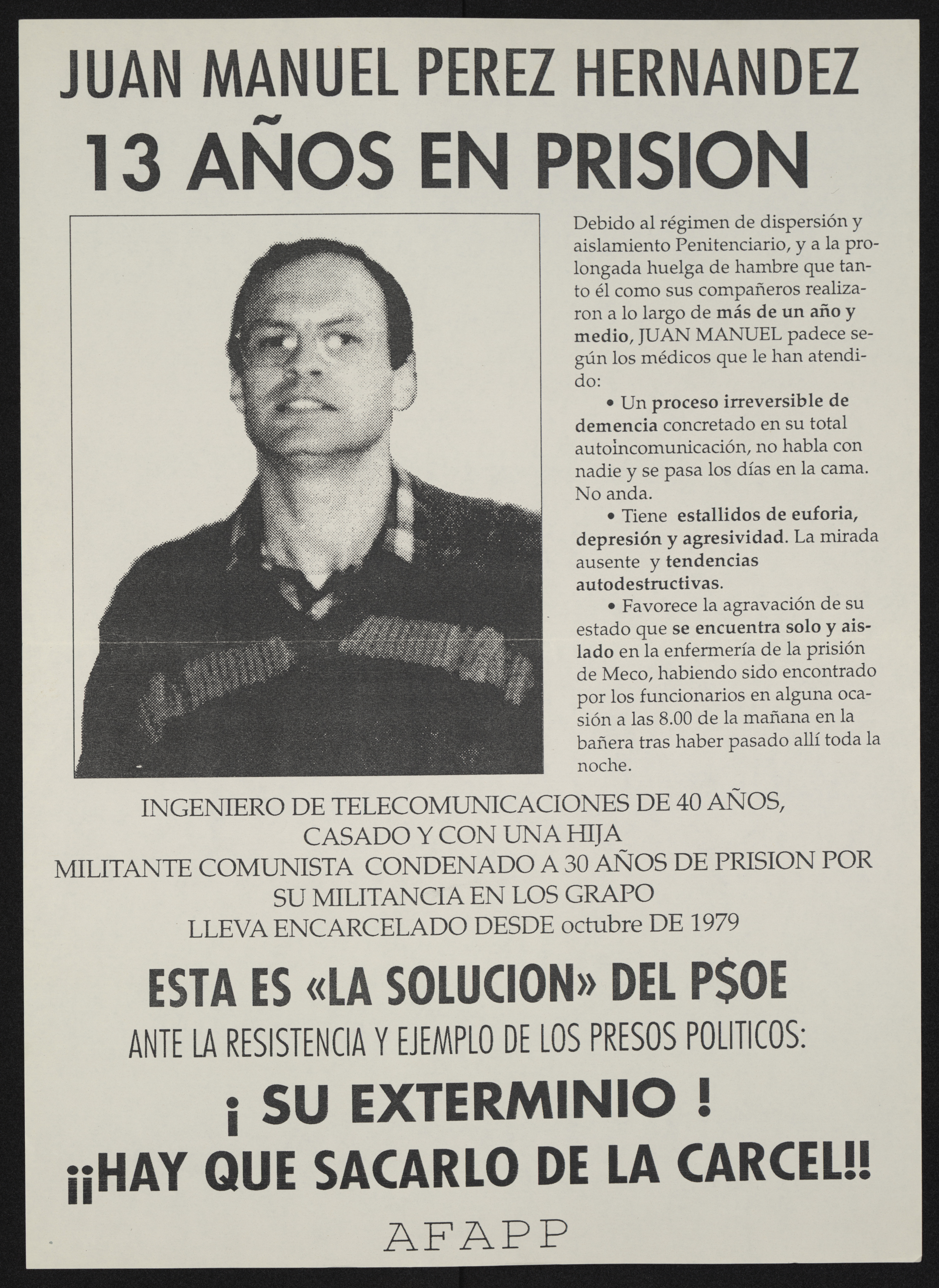 Poster shows a black and white photo of Juan Manuel Perez Hernandez wearing glasses, a v-neck pullover sweater with a plaid shirt underneath it. He is looking directly at the camera with a slight smile. Text to the right of his photo describes the deterioration of his mind and body due to prison conditions and his 18-month hunger strike. He has dementia that is exacerbated by his isolation. This poster calls for his release.