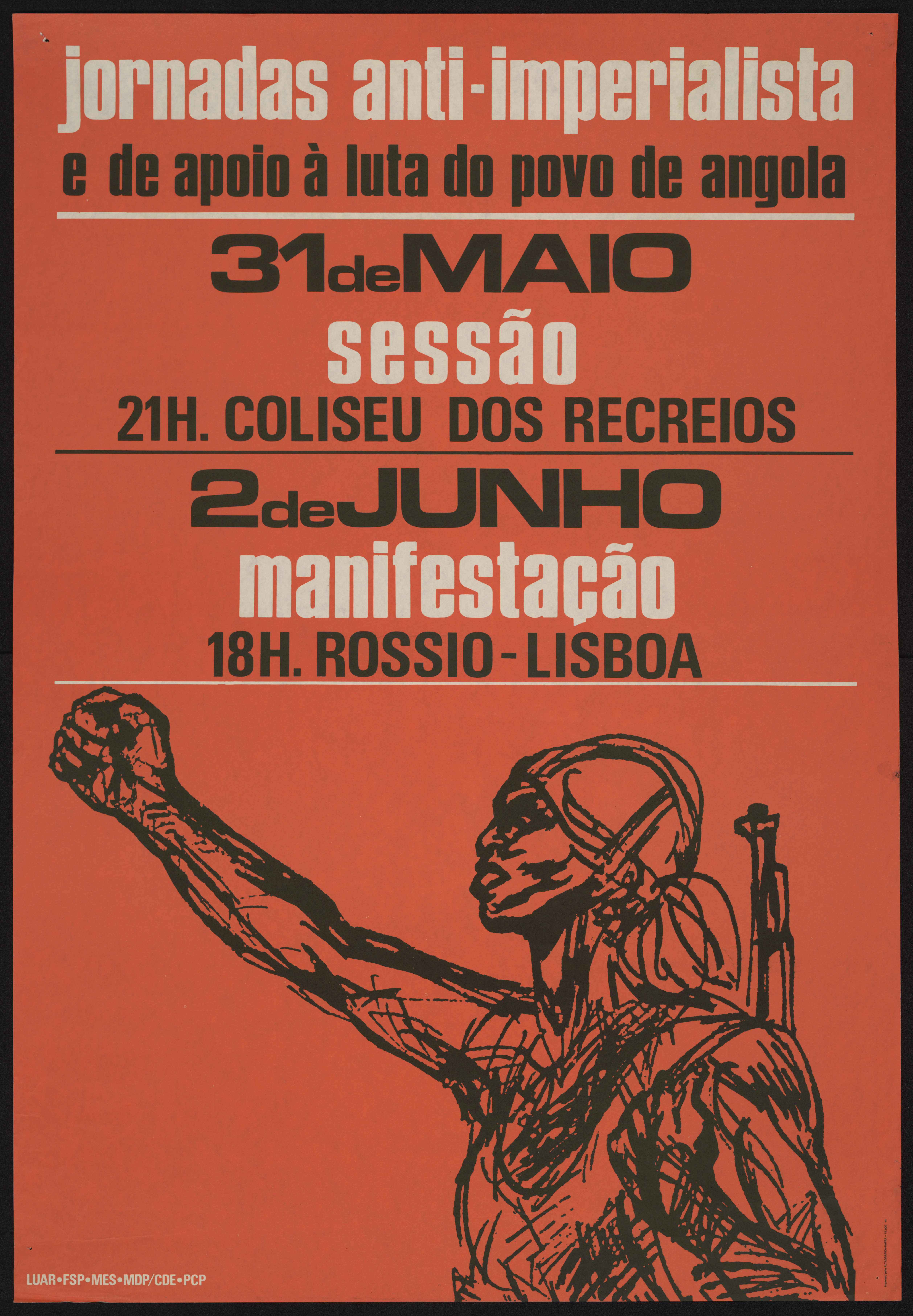 Poster shows an Angolan guerilla fighter wearing a headscarf, rifle slung over the left shoulder, right fist raised high, defiantly determined facial expression. Lists the details regarding two gatherings in support of the Angolan fight against imperialism. Ink is red and black.