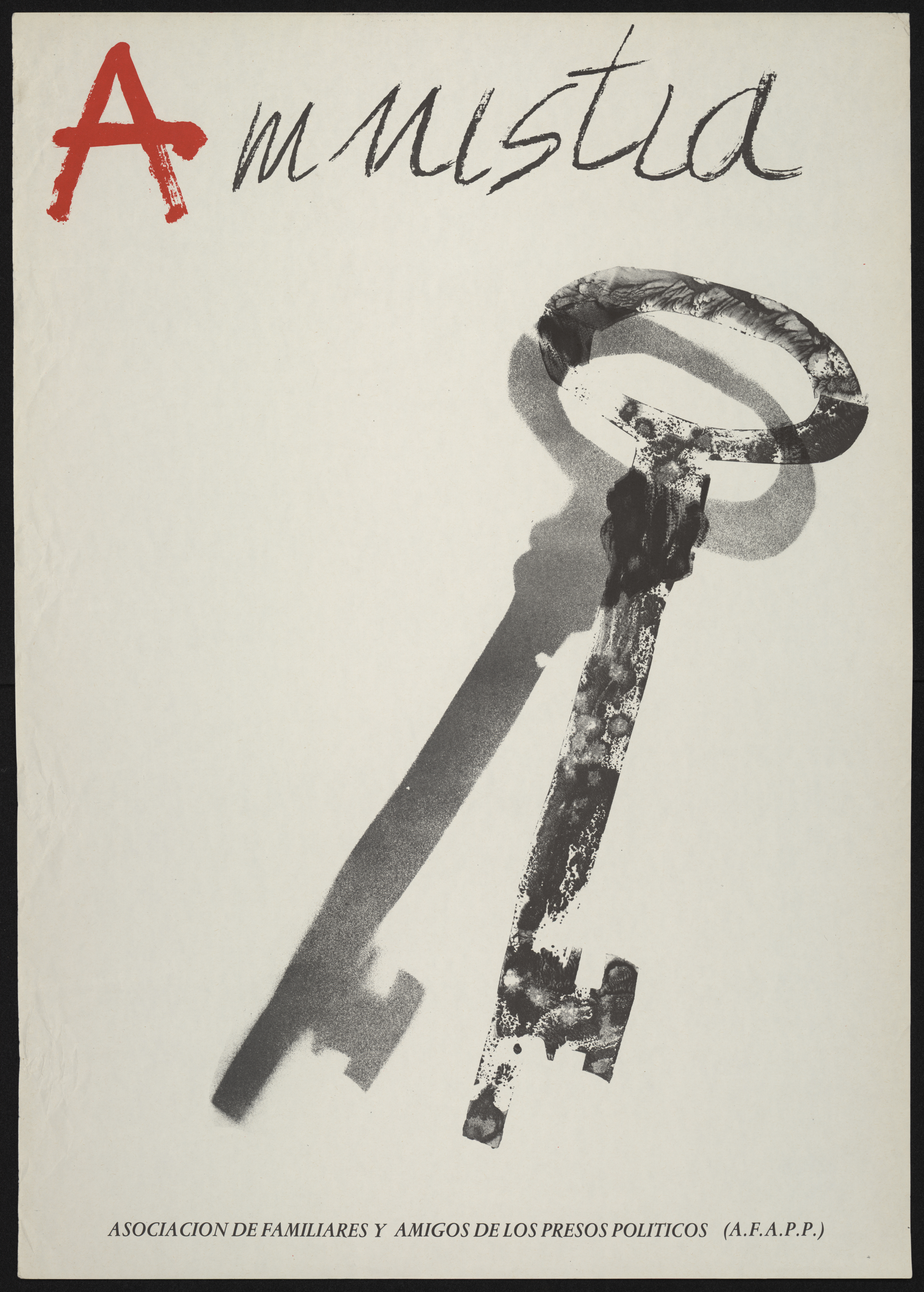 Poster shows an arm to the elbow with the fist punching skyward out of the ground of a colonnaded prison courtyard. Heavy black chains arch above the L-shaped prison building. Title printed in red with stars dotting the "i" letters. Ink is black and red.