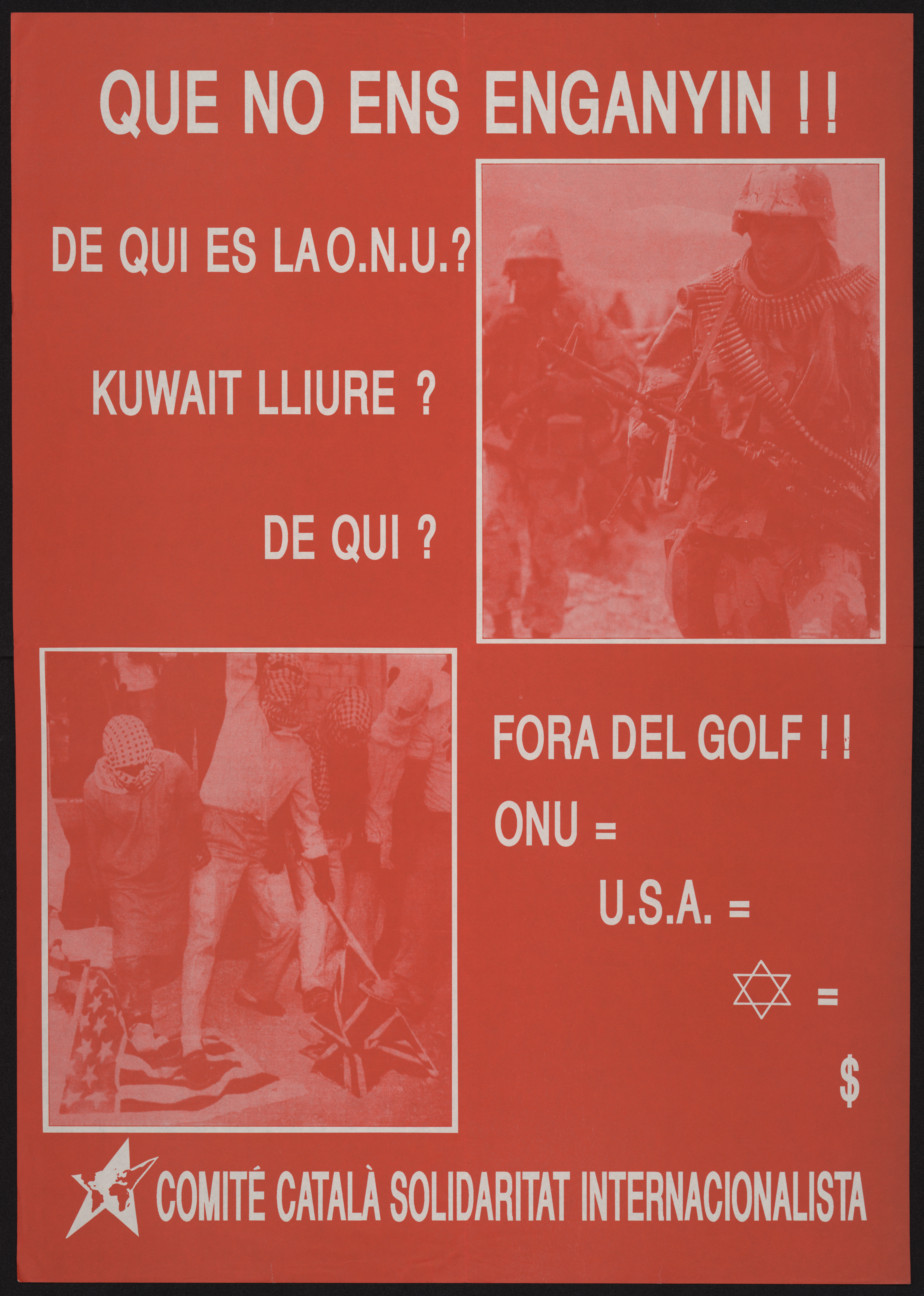 Que no ens enganyin!! : De qui es la O.N.U.? : Kuwait lliure? : Fora del Golf!! : ONU = U.S.A. = Star of David = $