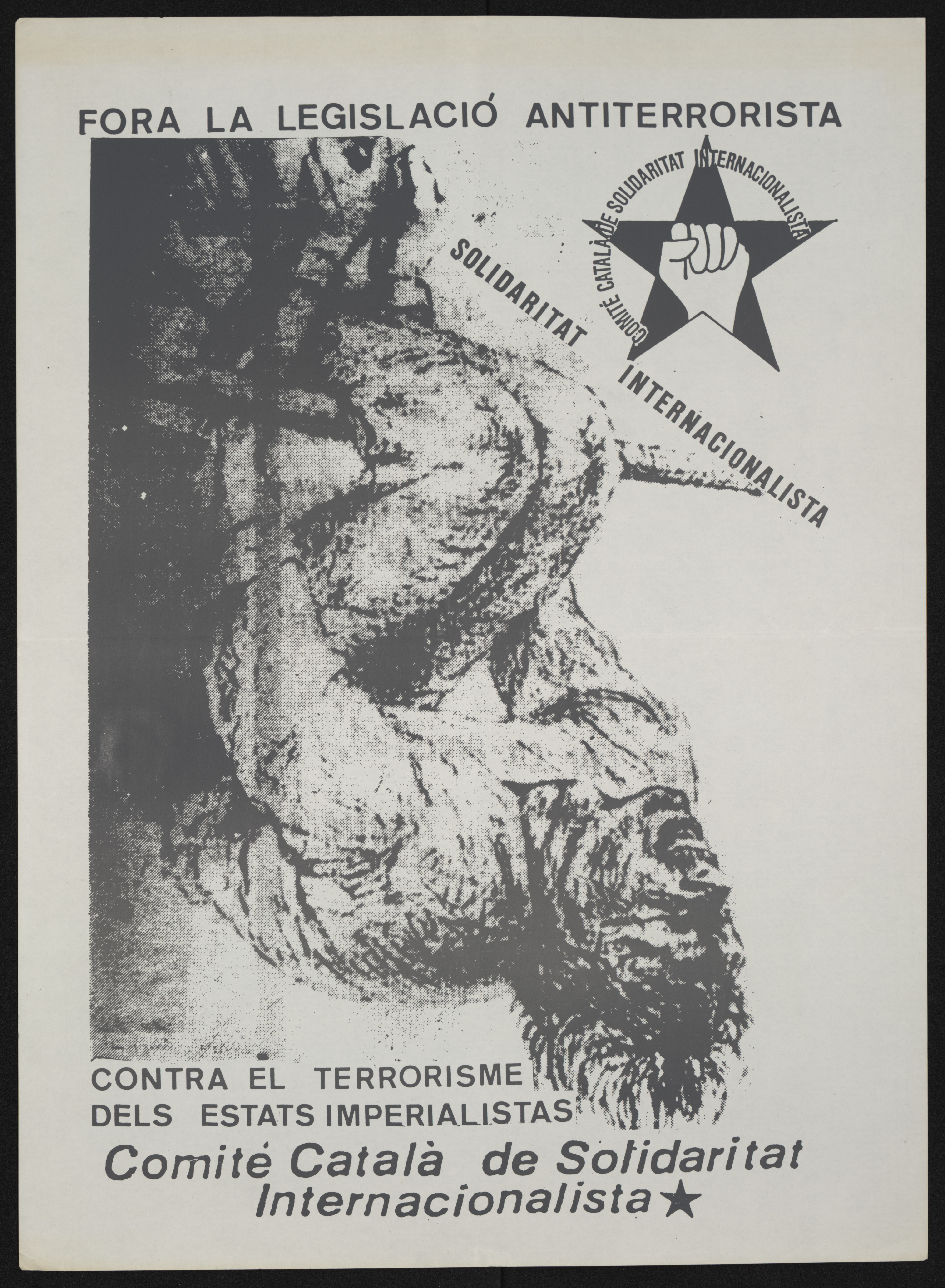 Black and white poster shows a man cying out while being tortured. He is hanging upside-down from a bar by his calves. His hands appear to be tied to his ankles. At top right of poster is a black star with a white fist in the center. Curved about that logo is "Comitè Català de Solidaritat Internacionalista." Printed below logo and slanting downward left to right to left is "Solidaritat Internacionalista." Calls for an end to the terrorism of imperialist states.