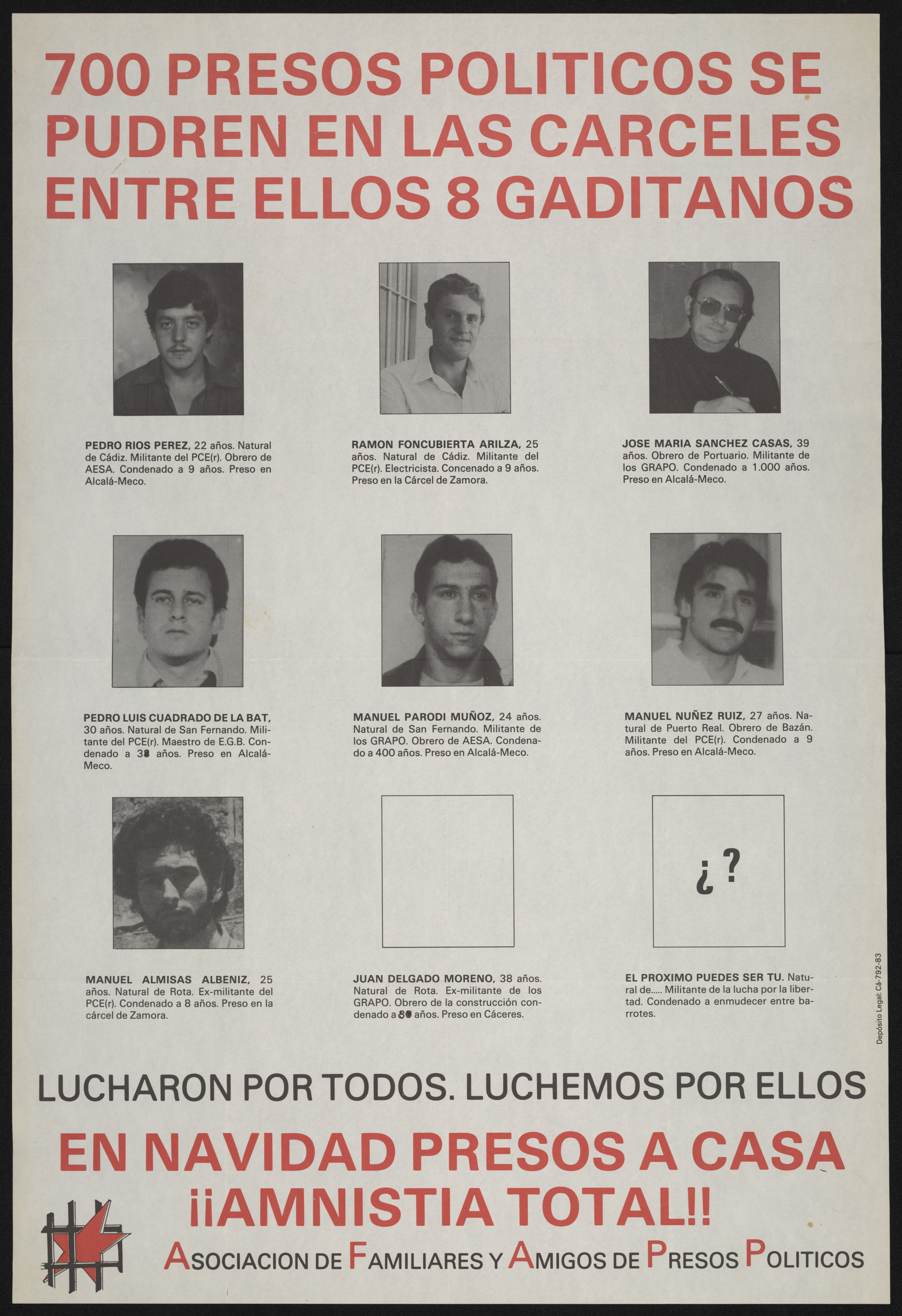 Poster shows black and white images of political prisoners of the Spanish urban guerrilla group GRAPO (Grupos de Resistencia Antifascista Primero de Octubre) and its political wing the PCE-r (Partido Comunista de España Reconstituido). Captions include: name, age, home town, group affiliations, length of sentence, and prison in which each is housed. One of the captions lacks the prisoner's image. Prisoners listed include: Pedro Rios Perez, Ramon Foncubierta Arilza, Jose Maria Sanchez Casas, Pedro Luis Cuadrado de la Bat, Manuel Parodi Muñoz, Manuel Nuñez Ruiz, Manuel Almisas, and Juan Delgado Moreno. The last caption appears below two question marks and states, in rough translation: The next one could be you--a militante in the fight for freedom, condemned to silence behind bars. Most of the men are in their 20s and sentenced to 9 years. One is condemned to 400 and another to 1,000 years. Bottom left of poster is a red star partially behind [prison cell?] bars. Ink is red and black.
