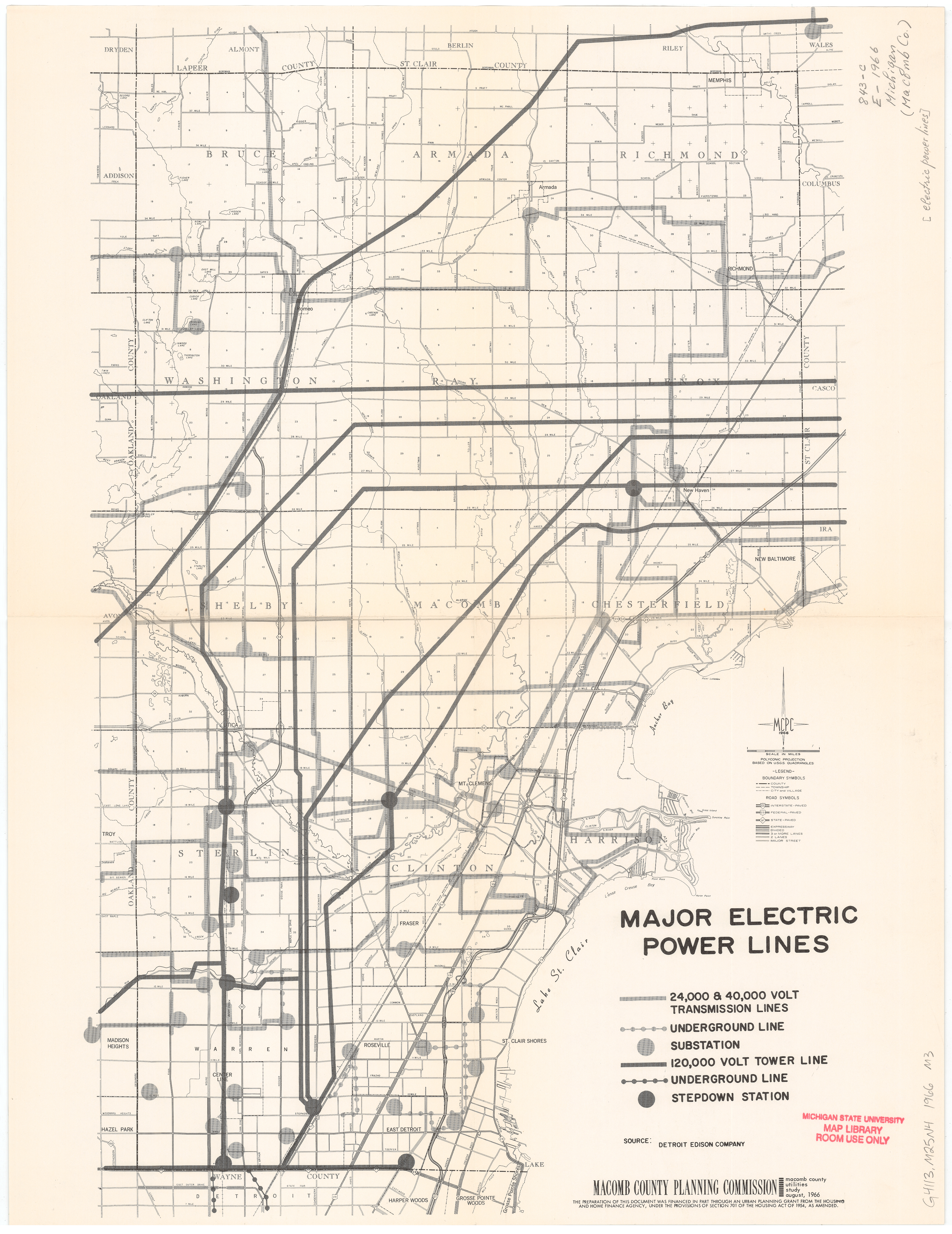 Map of Macomb County, Michigan, showing "24,000 & 40,000 volt transmission lines," underground lines, substations, "120,000 volt tower lines," and "stepdown stations."