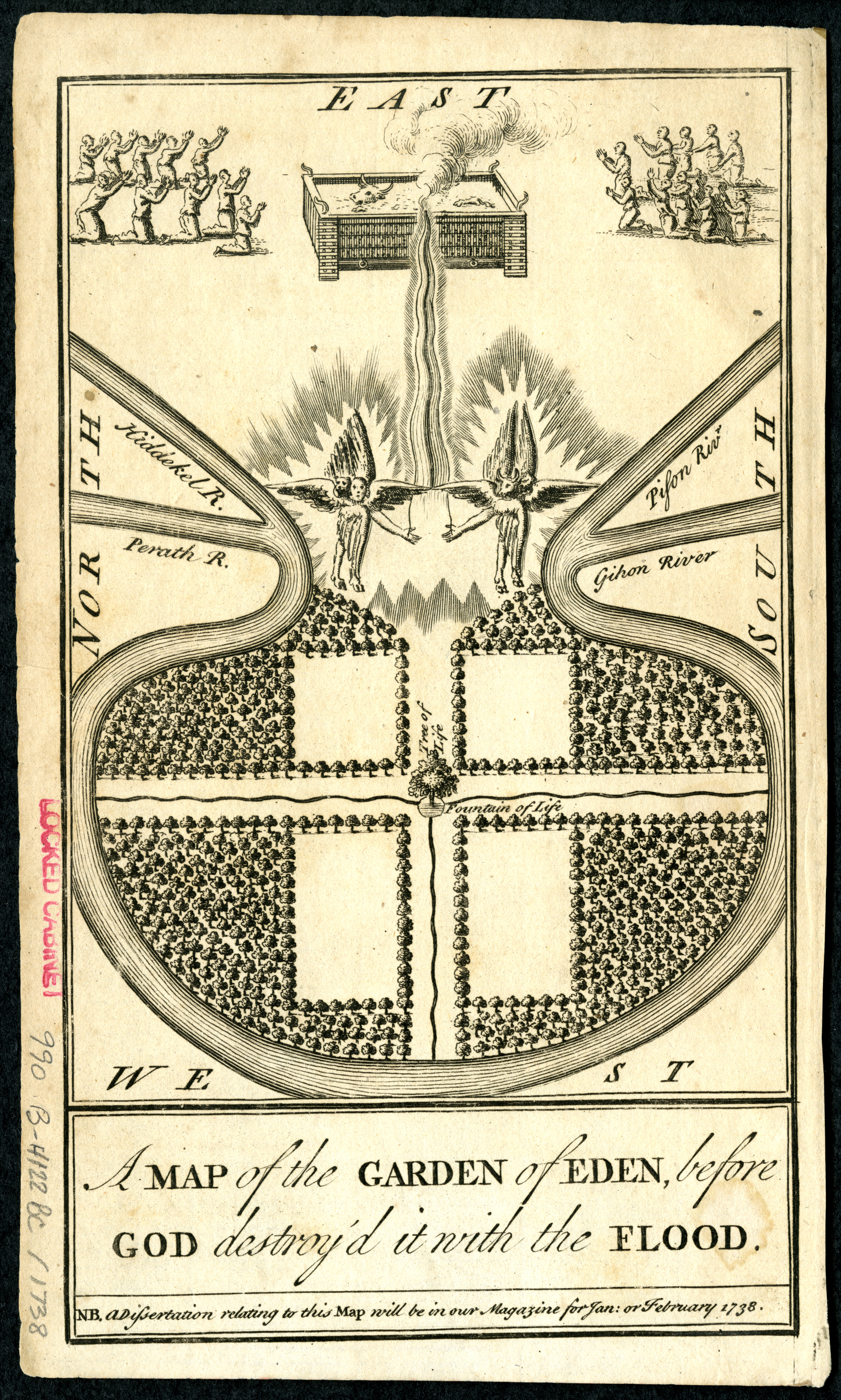 Map detached from Gentleman's magazine, likely from either the December 1737 issue or a supplement to the December 1737 issue, in volume VII. Associated with the article "Account of the Garden of Eden, by the author of Account of the Old World" on pages 66-69 of the February 1738 issue, in volume VIII.