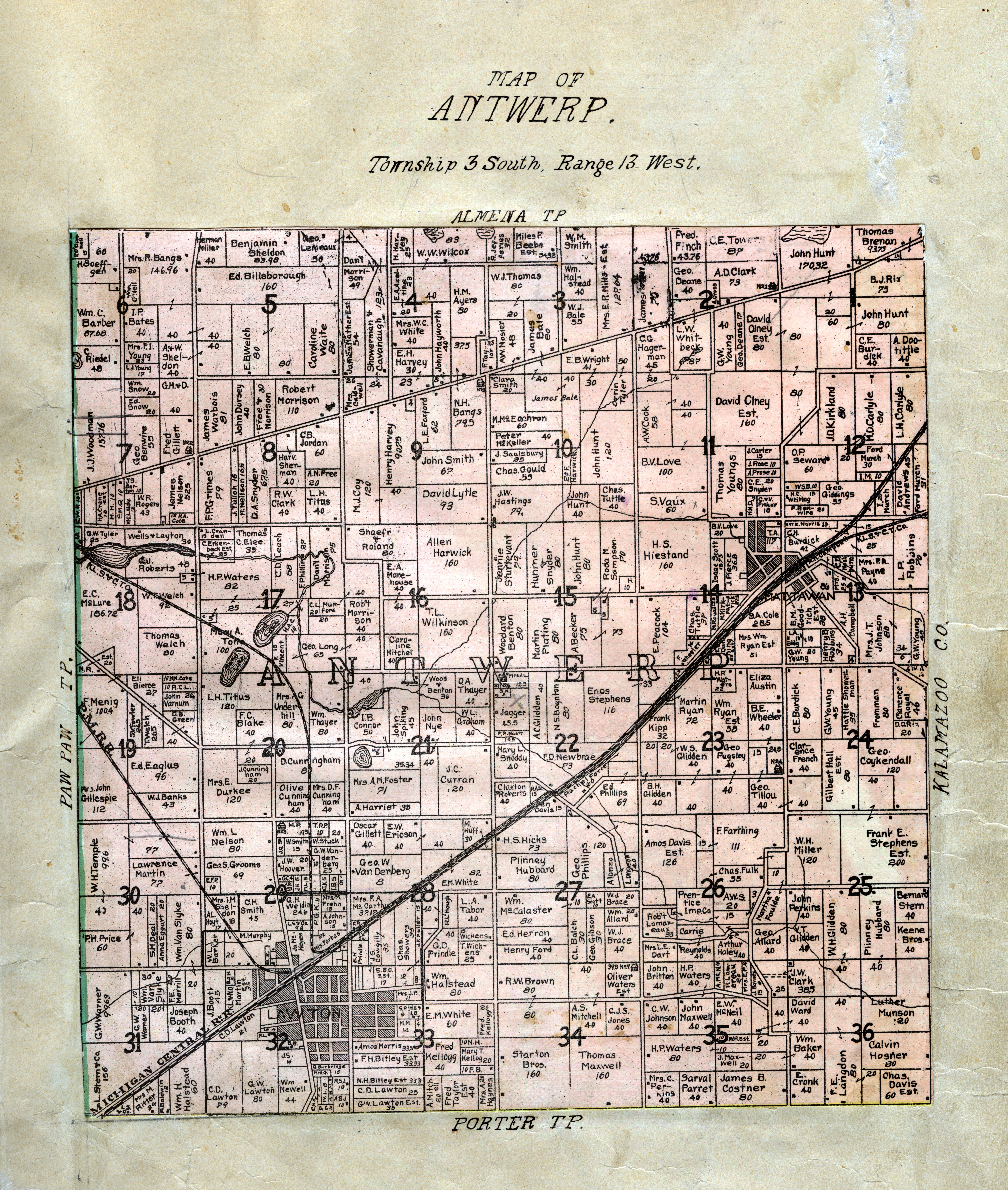 Digital scan of the Antwerp Township portion of a larger 1906 map of Van Buren County, Michigan. The county map was cut into township-sized pieces, and the pieces were later found pasted into an 1895 atlas of Van Buren County, now in the collection of the Michigan State University Map Library. Each township map cut from the 1906 county map was pasted onto a blank page opposite the map of the corresponding township in the 1895 county atlas. Shows parcel boundaries and names of property owners, Public Land Survey System township and section numbering, roads, railroads, residences, schools, churches, municipalities, and water features.
