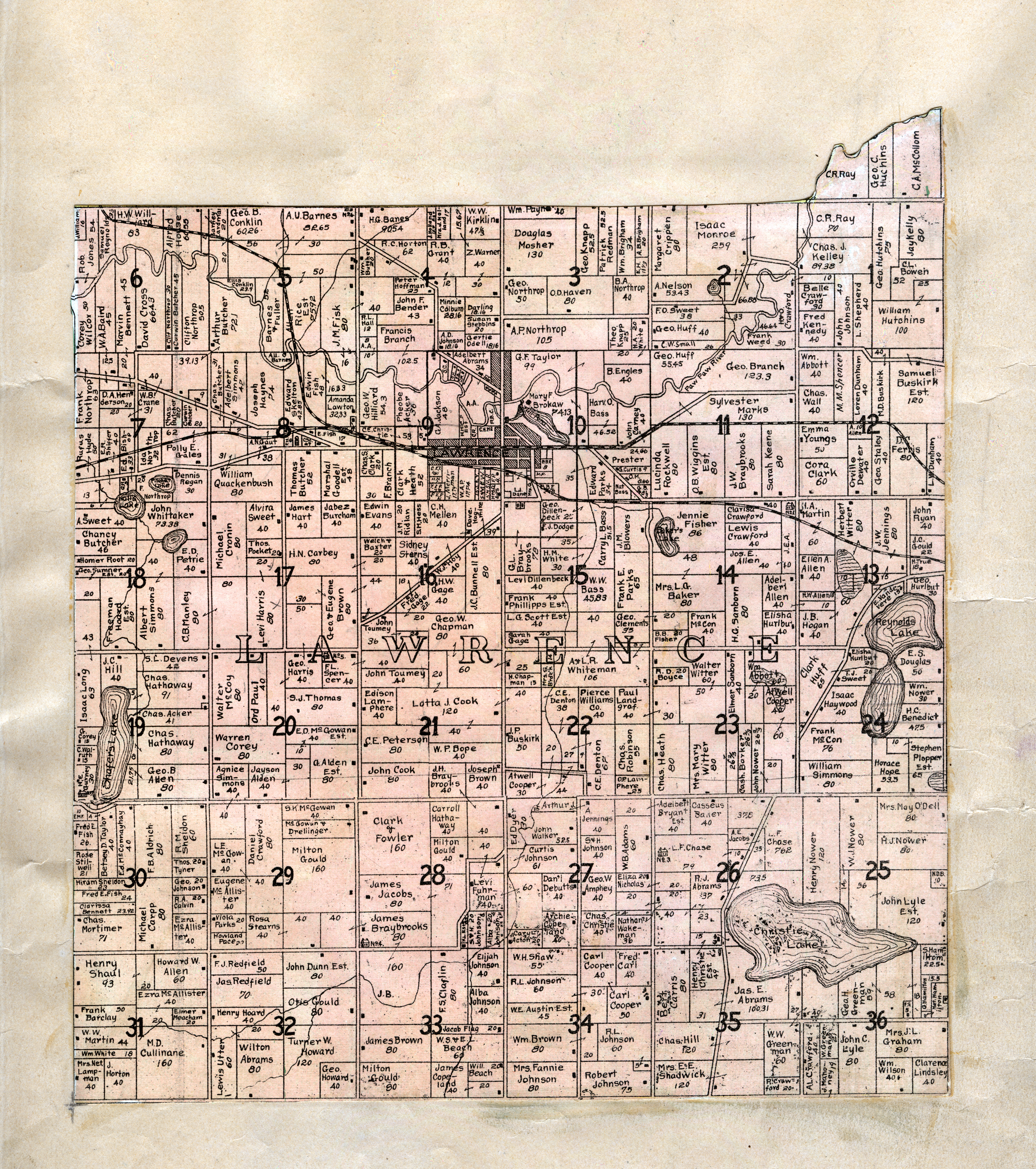 Digital scan of the Lawrence Township portion of a larger 1906 map of Van Buren County, Michigan. The county map was cut into township-sized pieces, and the pieces were later found pasted into an 1895 atlas of Van Buren County, now in the collection of the Michigan State University Map Library. Each township map cut from the 1906 county map was pasted onto a blank page opposite the map of the corresponding township in the 1895 county atlas. Shows parcel boundaries and names of property owners, Public Land Survey System township and section numbering, roads, railroads, residences, schools, churches, municipalities, and water features.