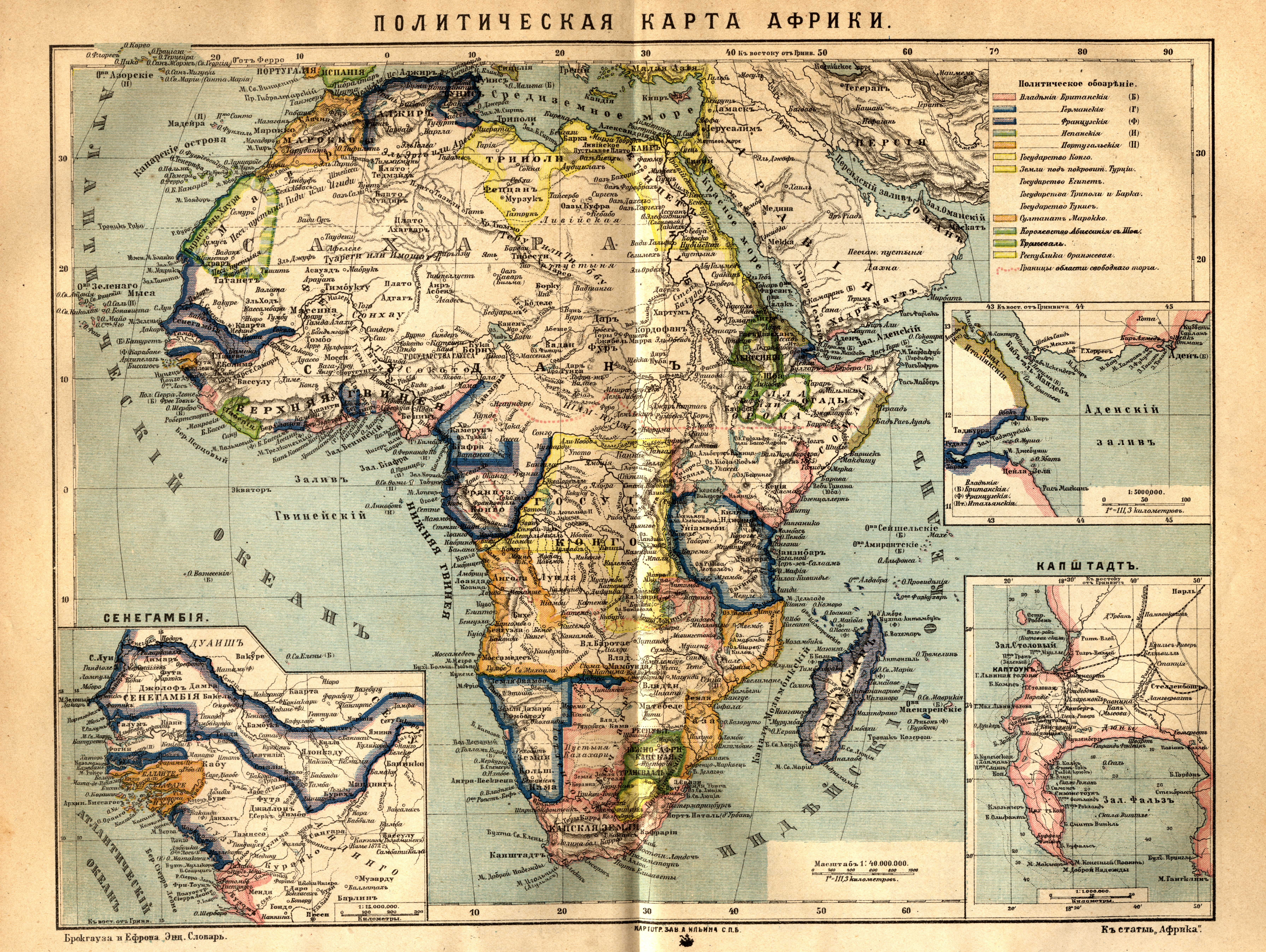 Digital scan of a political map of Africa from a late-19th century Russian encyclopedia.