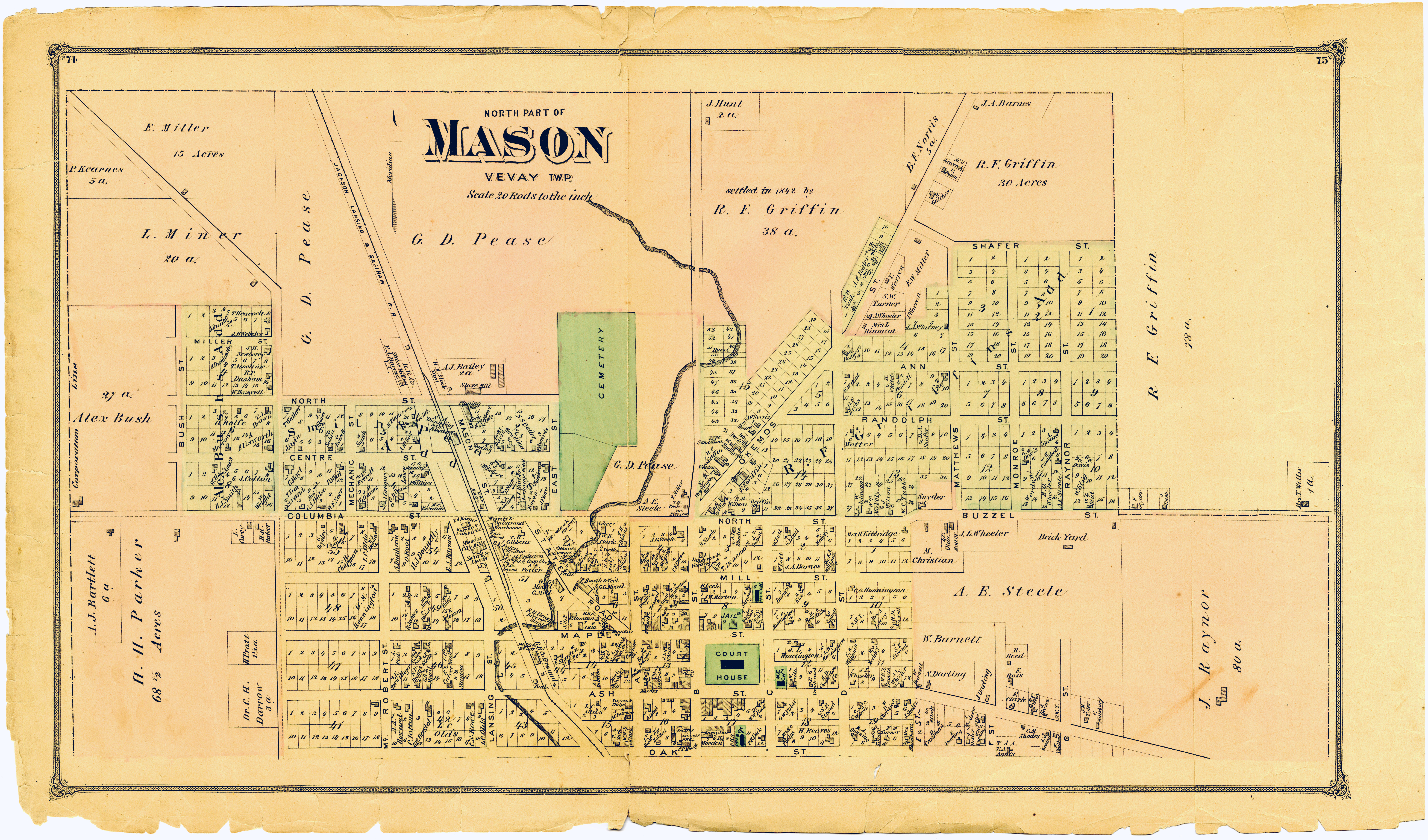 Cadastral maps of Mason showing property boundaries, building footprints, and names of property owners. Shows former "A Street," "B Street," etc., street naming system.