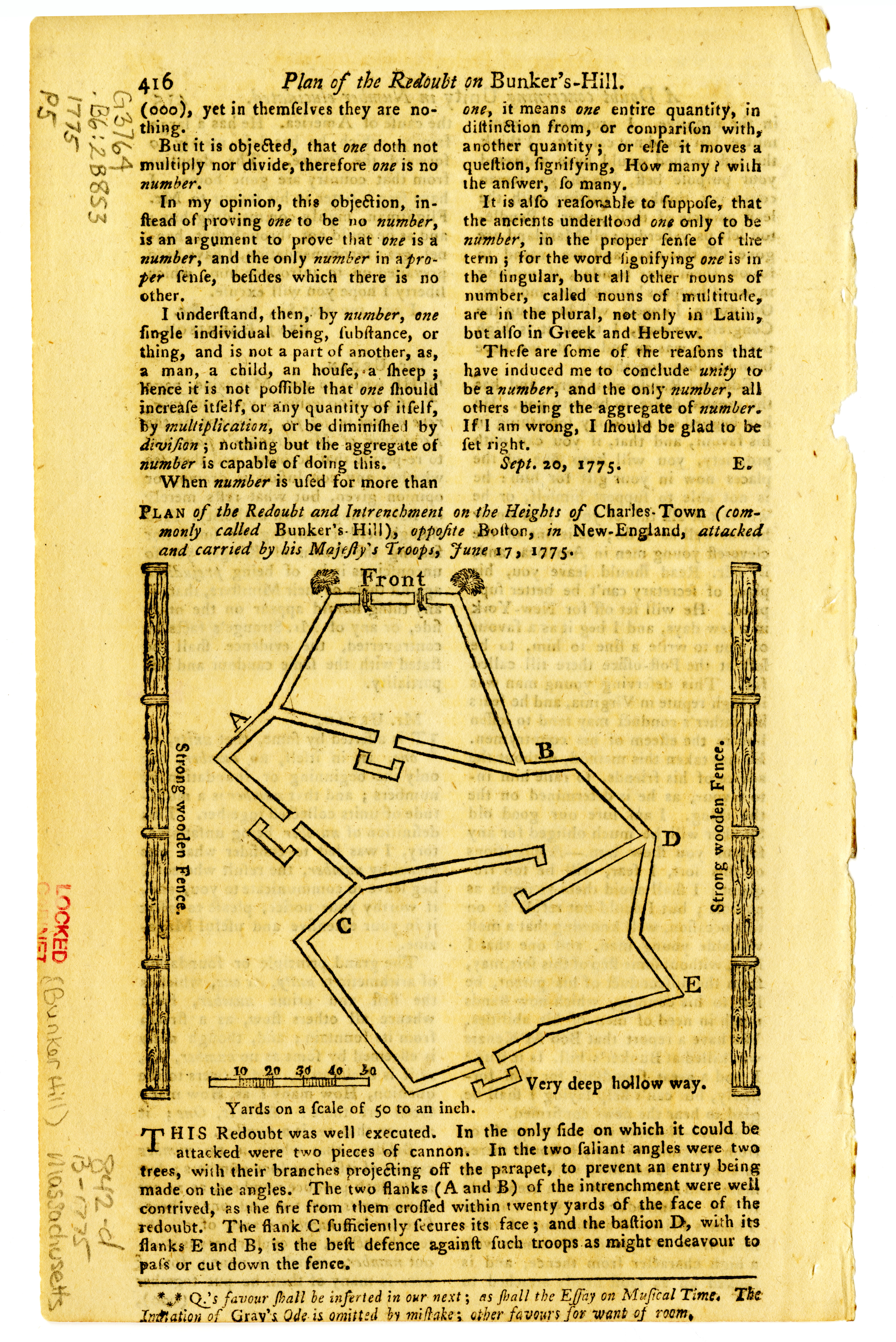 Plan of the redoubt and intrenchment on the heights of Charles Town, commonly called Bunker's Hill, opposite Boston, in New England, attacked and carried by his Majesty's troops, June 17, 1775