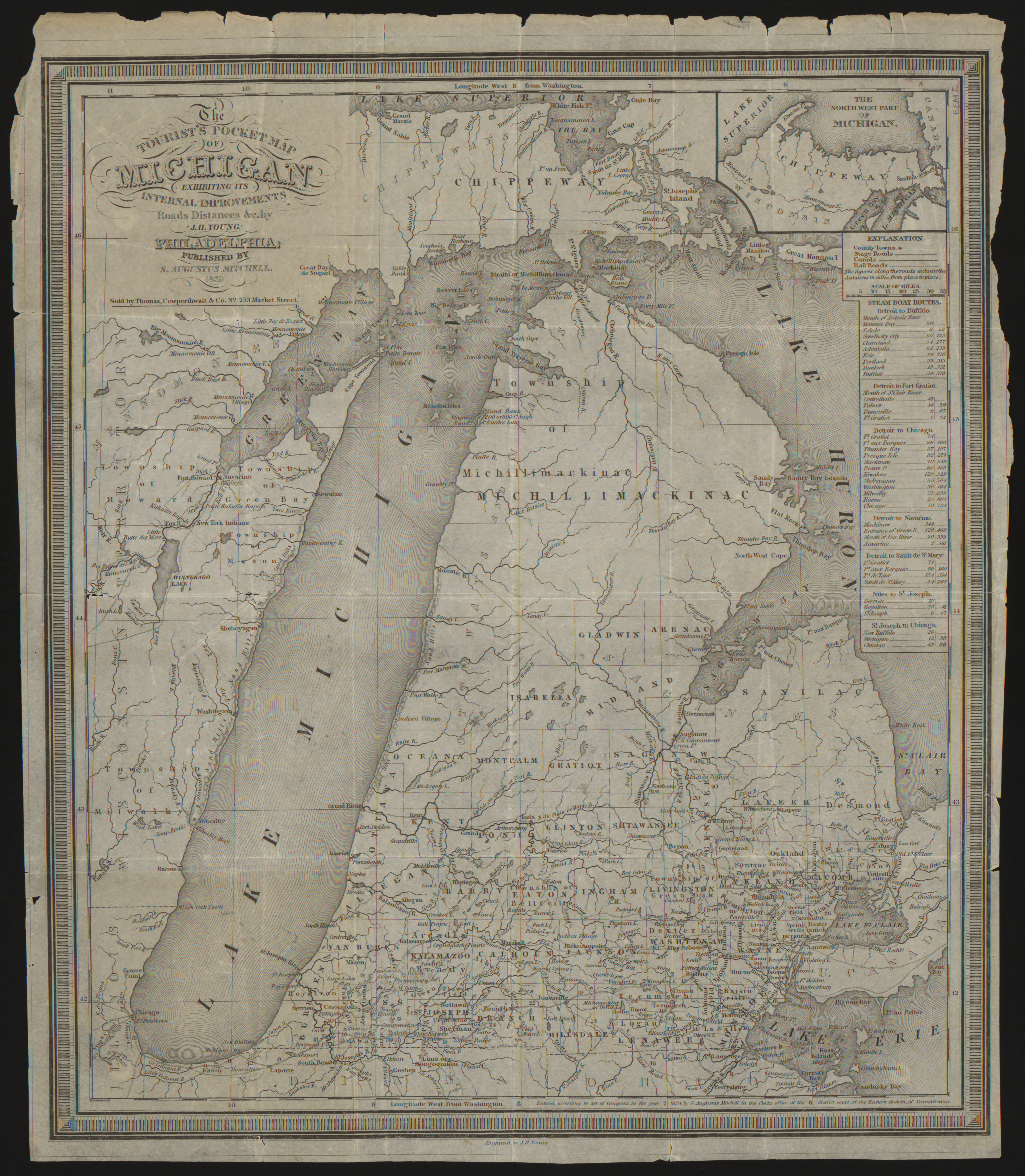 The tourist's pocket map of Michigan : exhibiting its internal improvements, roads, distances, &c
