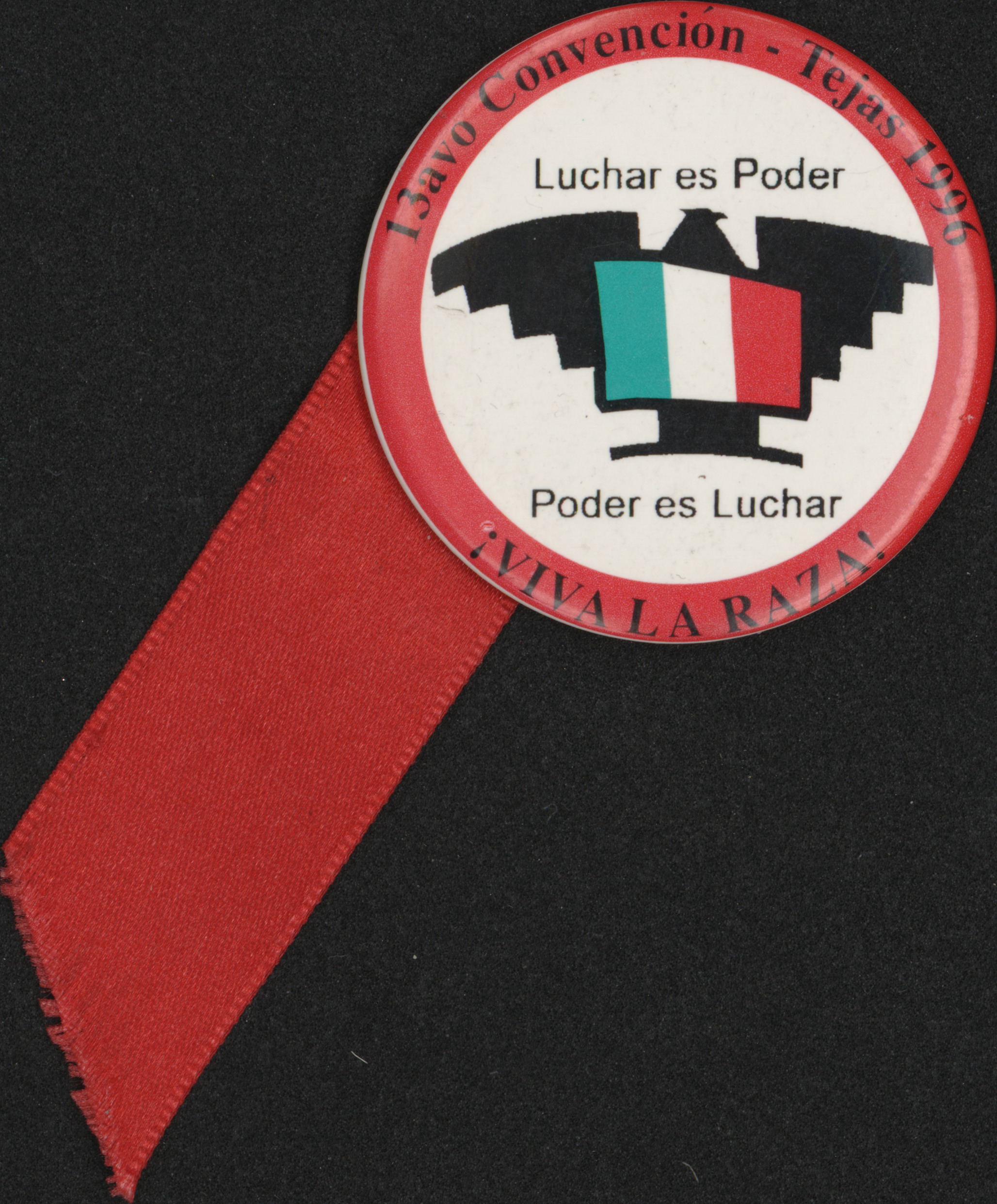 13th Convention pin. Red with white center, black union eagle & Mexican flag in color. Text: Luchar es poder, poder es Luchar (Fighting is Power/Power is Fight)