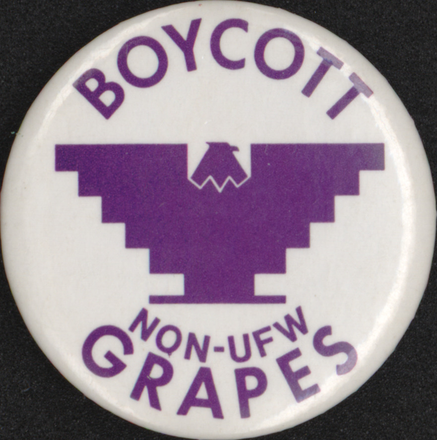 Boycott non-UFW grapes; union bug white with purple text and purple symbol
