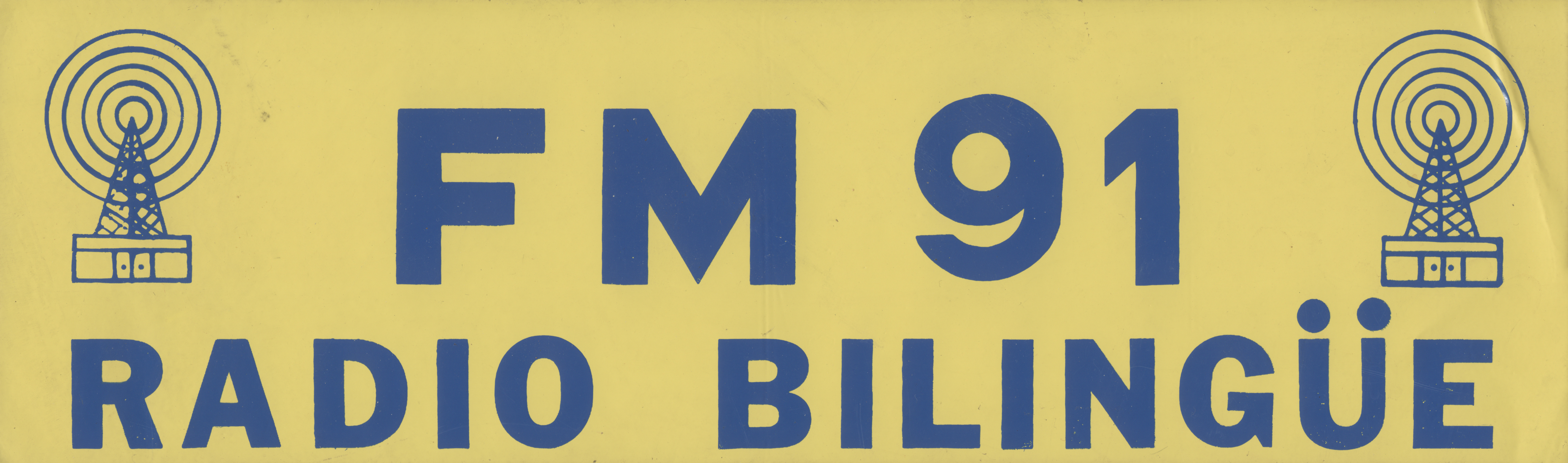 Two blue radio towers one on each side of the top. Blue font and yellow background. For KSJV FM 91.