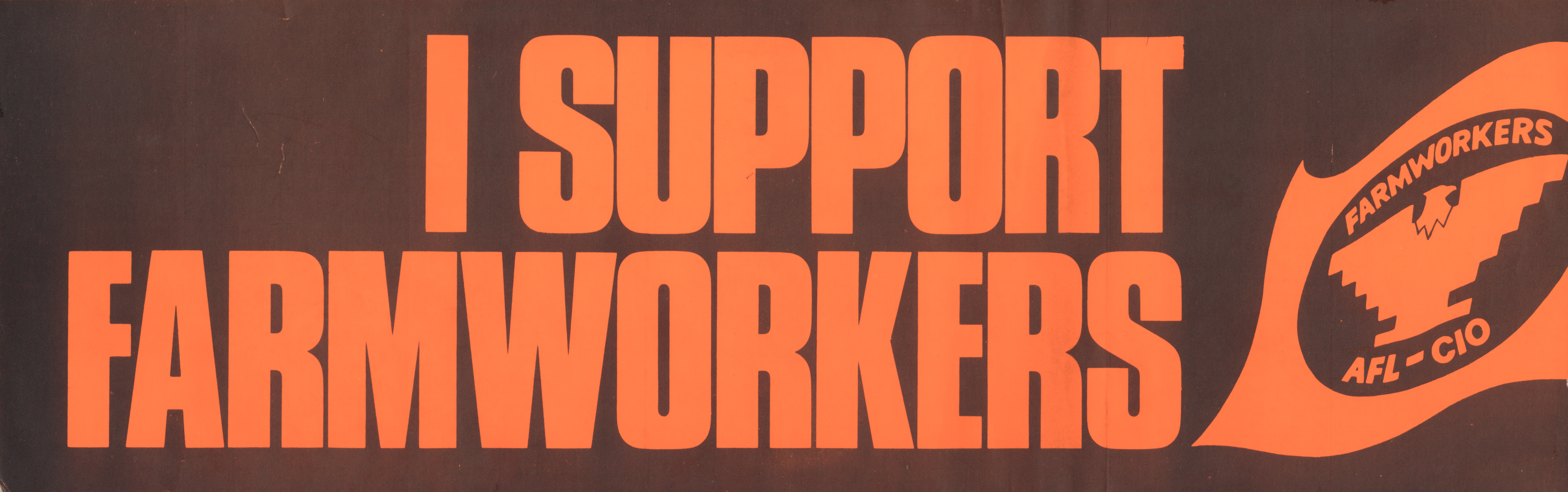 Thunderbird seal on right side with Farmworkers above and AFL-CIO below. Orange font on brown background.