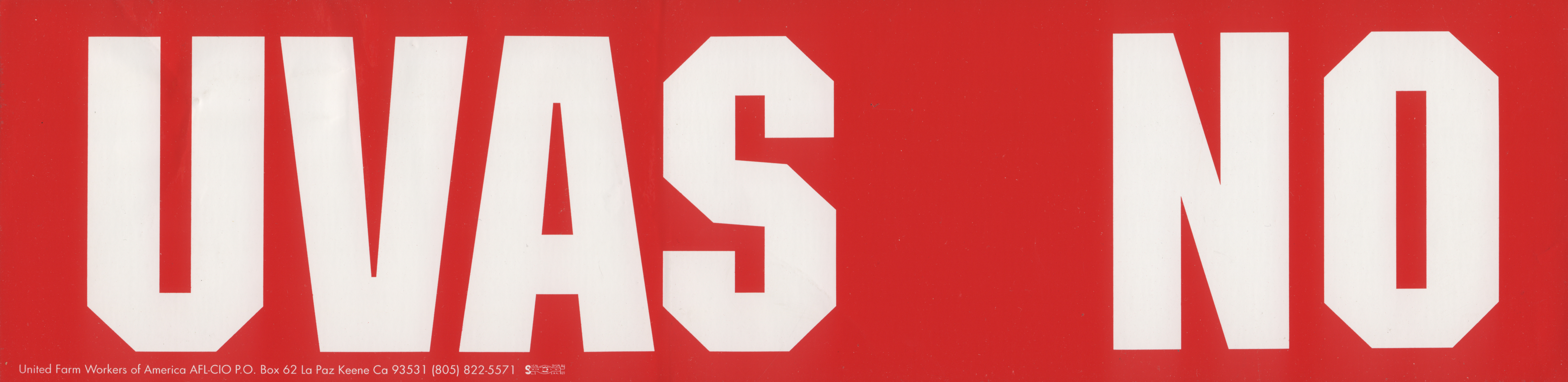 White Font with red background. United Farm Workers of America, AFL-CIO, Box 62, La Paz Keene, California 93531 (805) 822-5571.
