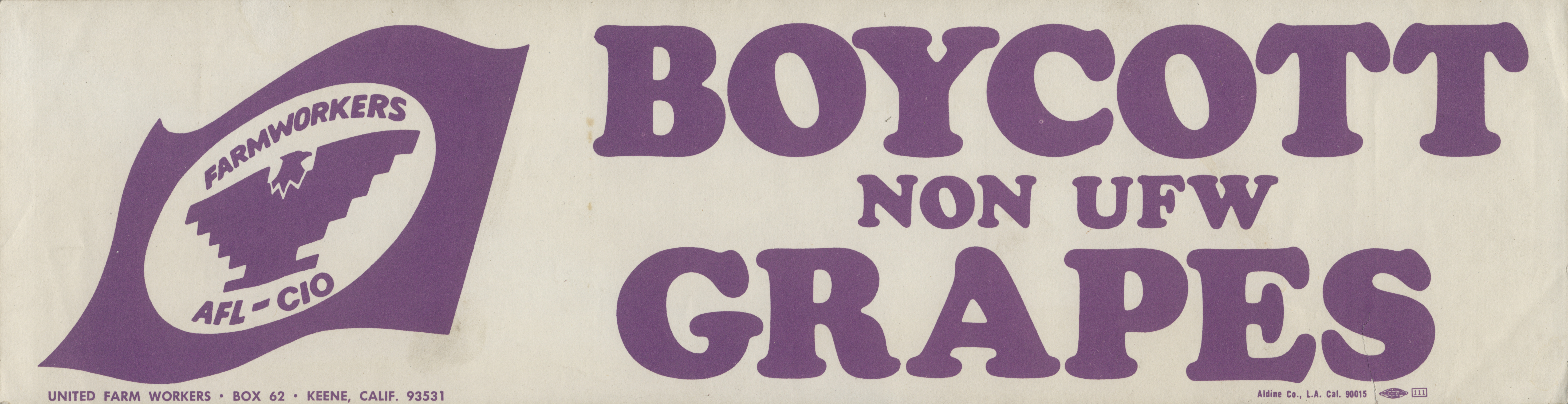 UFW Seal on left side. Purple font on a white background. United Farm Workers, Box 62, Keene, California 93531.