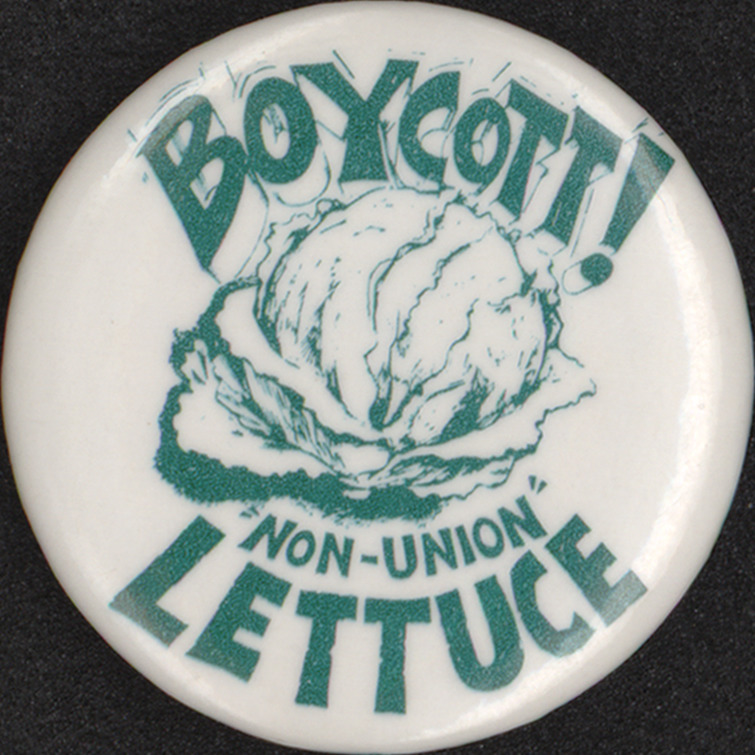 Boycott non-union Lettuce; union bug; white background with green text and green illustration of head lettuce