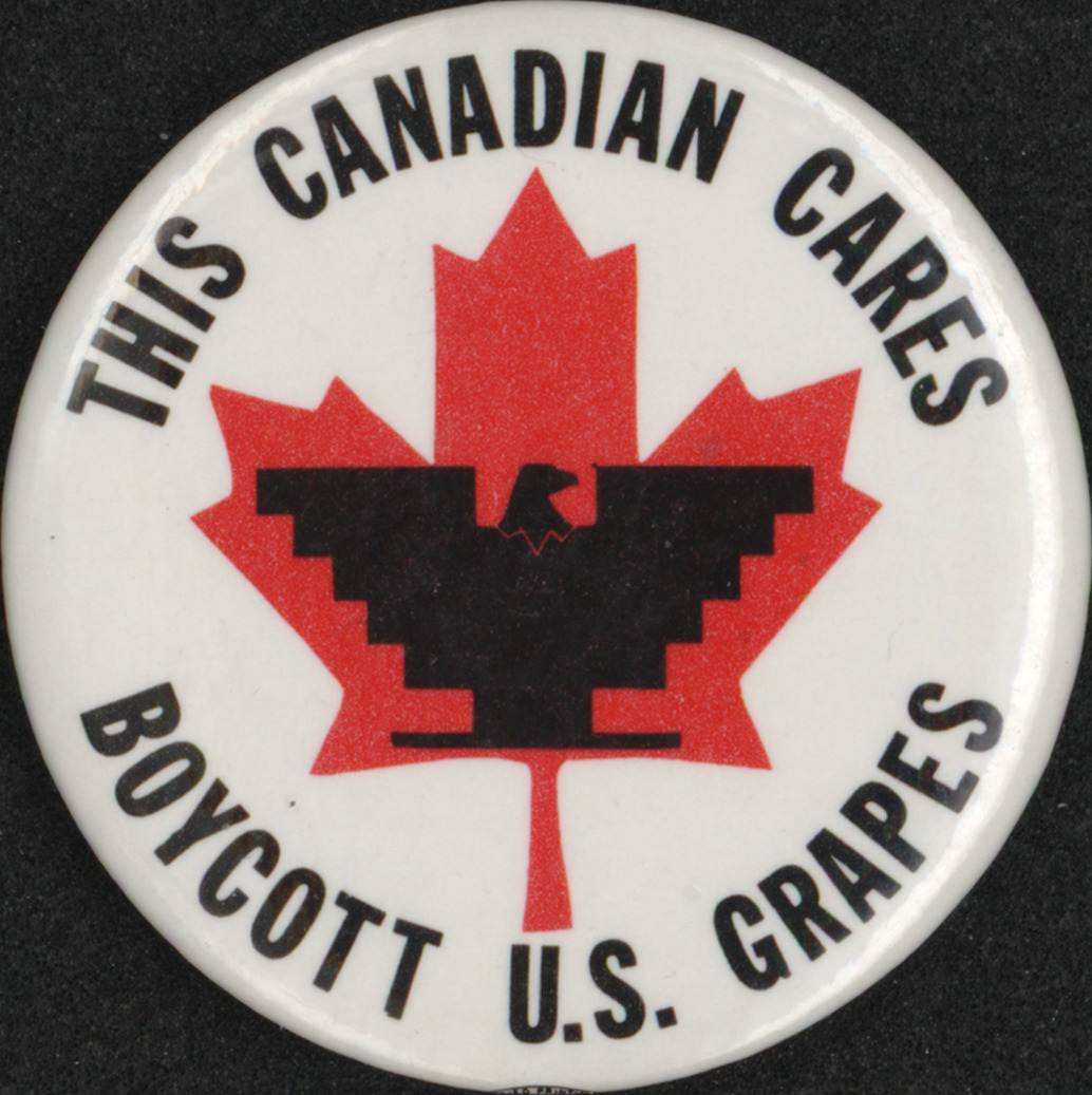 This Canadian cares boycott U.S. grapes; union bug. White background with black text and union eagle on red maple leaf