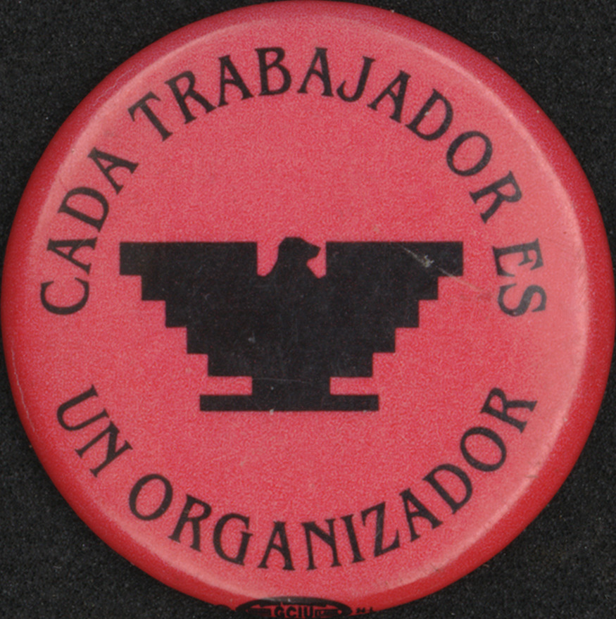 Red with black union eagle in center and black text. Union bug. Every worker is an organizer