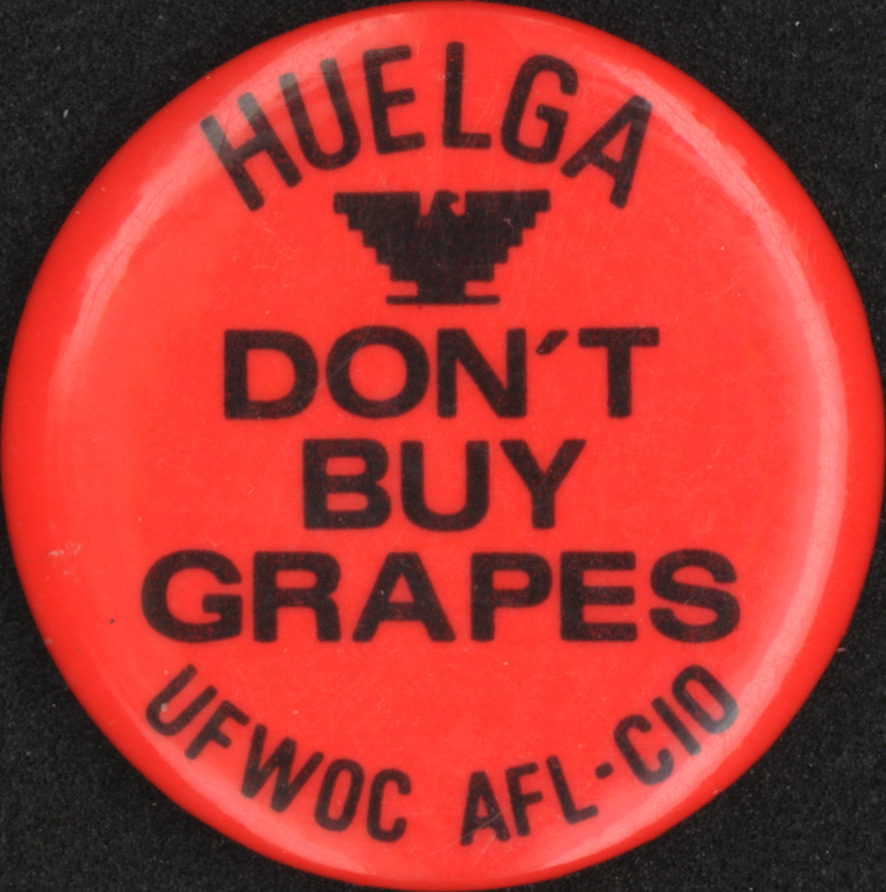 Huelga don't buy grapes UFWOC AFL-CIO; union bug; pink with black text and black symbol