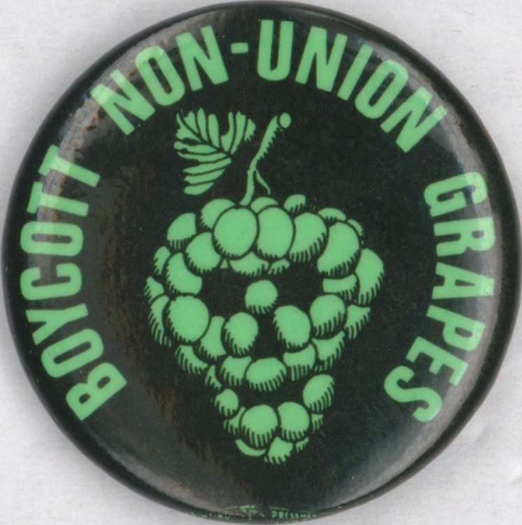 Boycott non-union grapes; union bug black background with green text, grape bunch in shape of skull