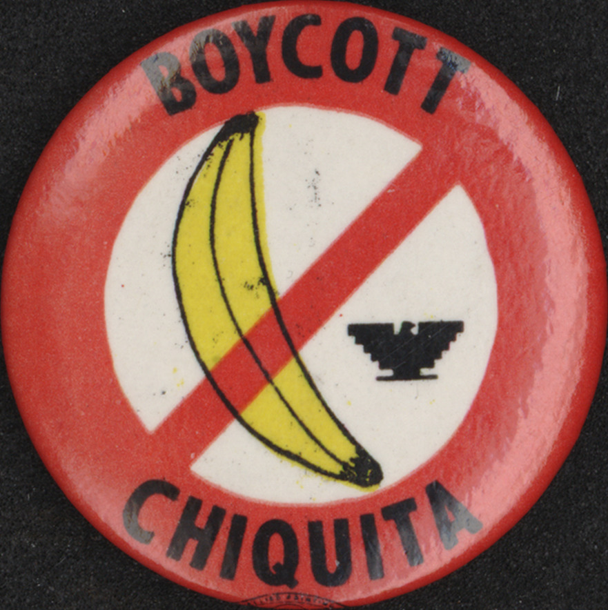 Red rim with white center. Red banned slash on white background; yellow banana inside and small black union eagle in lower right. Strike began in 1979 over wages when company owned by Sunharvest, parent company of lettuce being Boycotted.