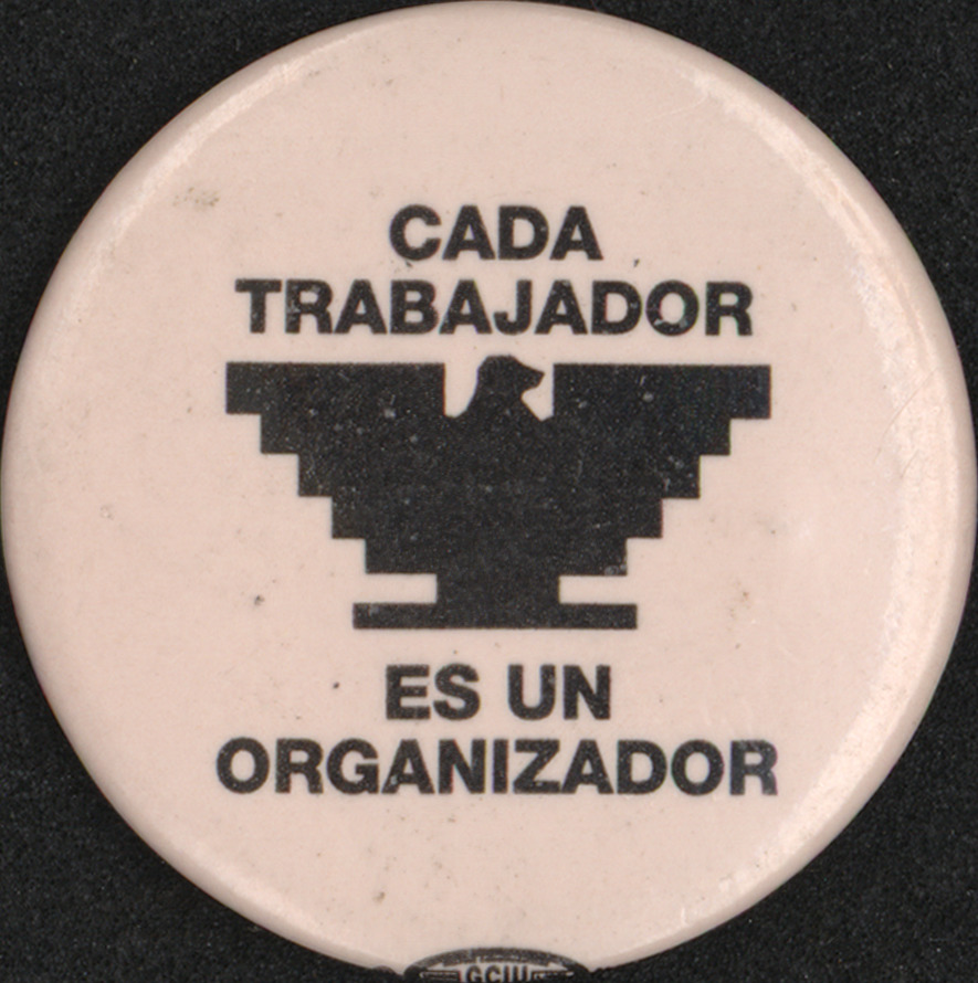 Pale pink with black text and black union eagle in Center. Every worker is an organizer