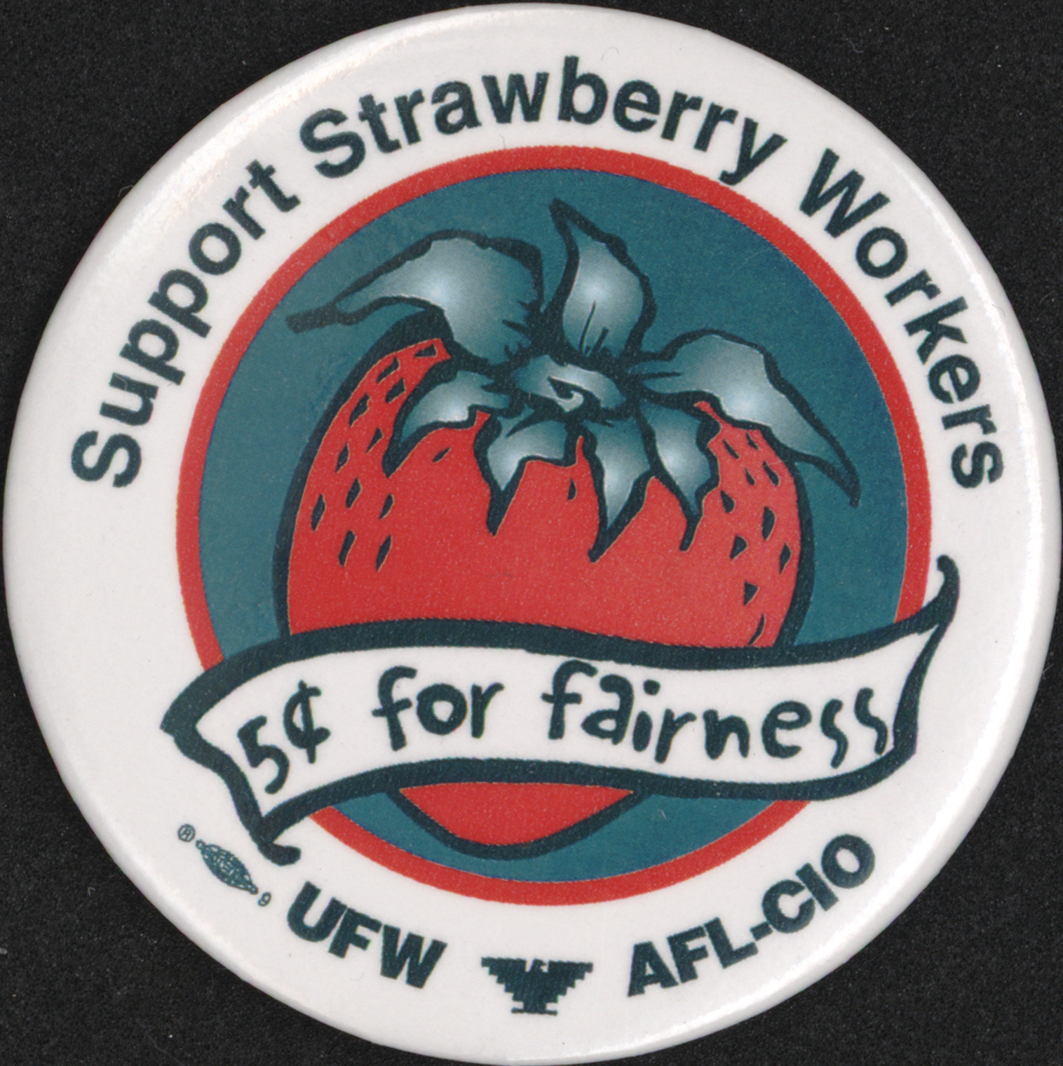 Support strawberry workers, 5¢ for fairness; union bug white and green background with green text and red/green illustration of strawberry