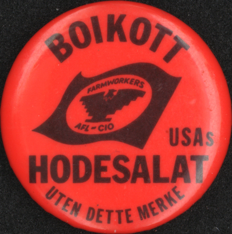 Boikott hodesalat USAs uten dette merke; Boycott lettuce, avoid this brand; red background with black text and black union flag symbol.