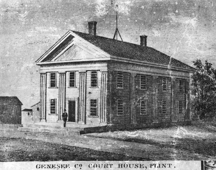 Black and white photo of the Genesee County Courthouse in 1859. Courthouse is the second courthouse of the county located where the current one stands on Saginaw St. in Flint, Michigan.