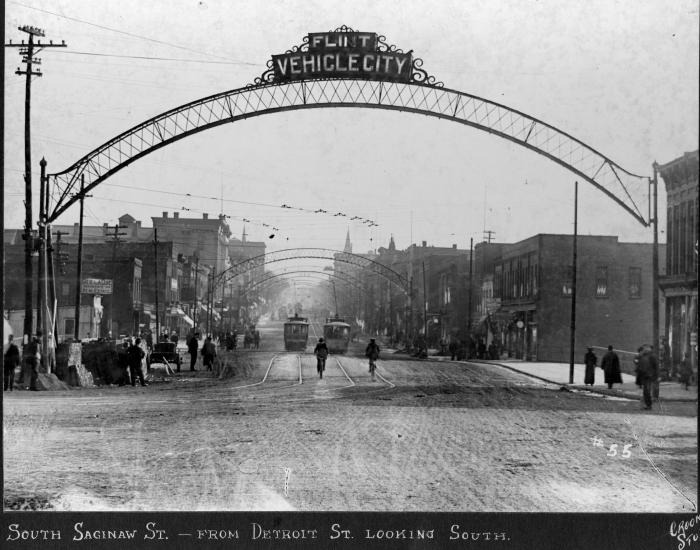 Black and white photo of Saginaw Street looking north showing the Vehicle City Arch erected in 1905 as part of the City's 50th anniversary.