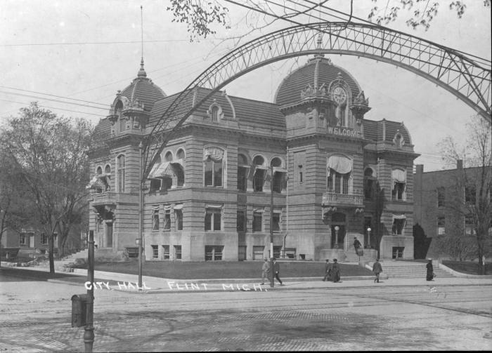 Black and white photo of the Flint City Hall in Flint, Michigan which was at Third St and S. Saginaw from 1909 to 1959. Building