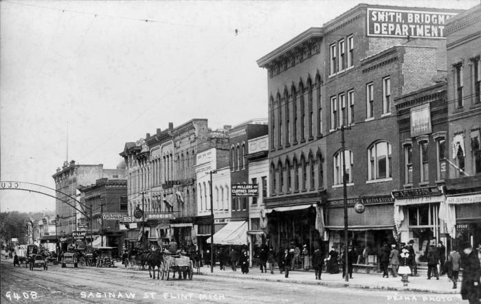 Black and white photo of Saginaw Street looking north from the intersection of First St. Smith Bridgmansn foreground.
