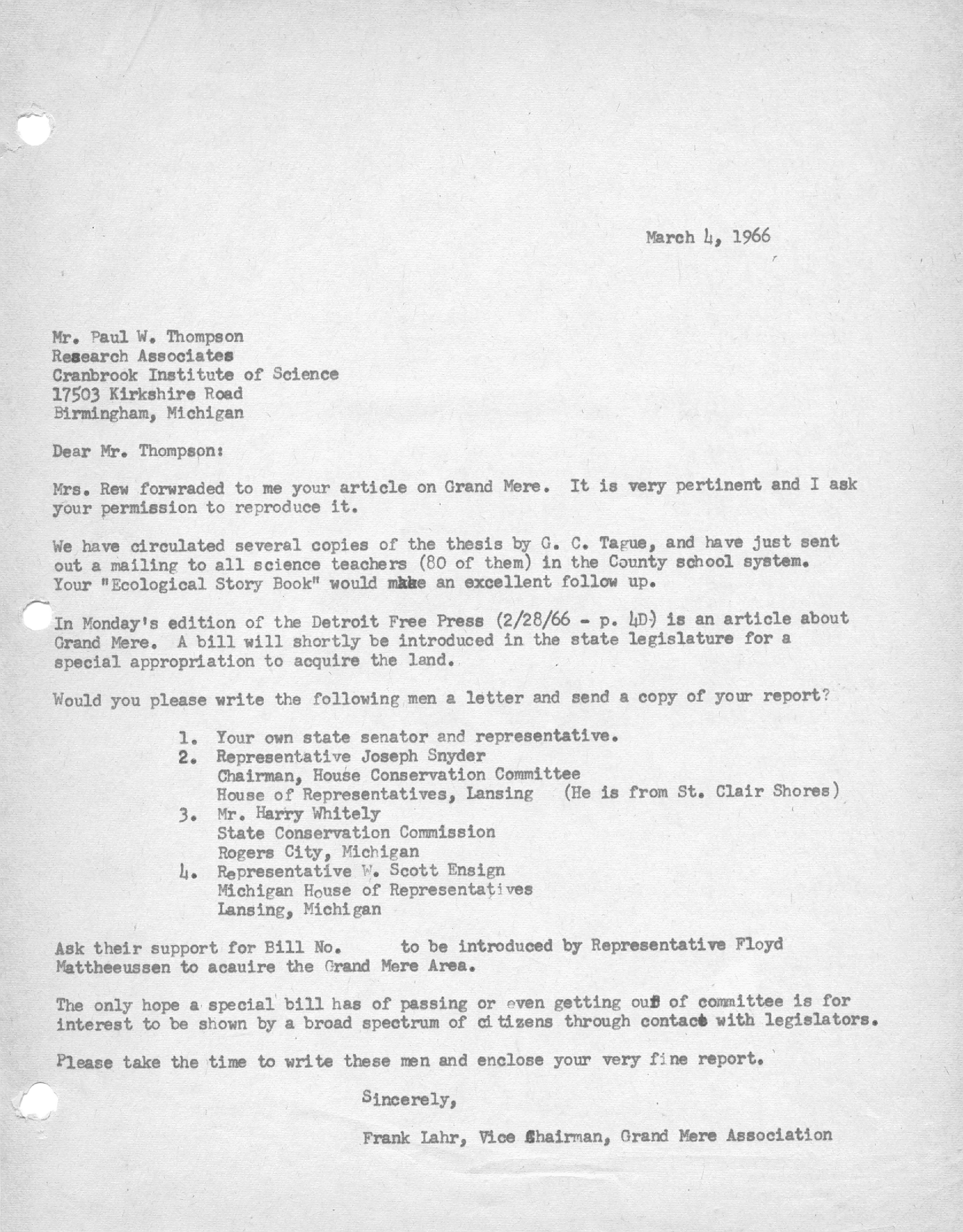 Original letter from Frank Lahr to Mr. Paul W. Thompson, Research Associates, Cranbrook Institute of Science